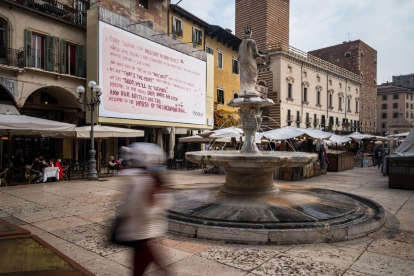 Partendo da Verona, la cantina si prepara a presentare anche “Pasqua House of The Unconventional”, la nuova piattaforma di marketing e comunicazione a livello globale, attraverso un suo “Manifesto”, una dichiarazione d’intenti e una carta d’identità al contempo, affidato alla maestria creativa e visione dell’artista italiano Giuseppe Ragazzini autore dell’opera svelata, dall’11 febbraio, con una grande affissione in Piazza delle Erbe, realizzata con un “inchiostro” unico, che dona corpo speciale alle parole: l’Amarone Famiglia Pasqua.