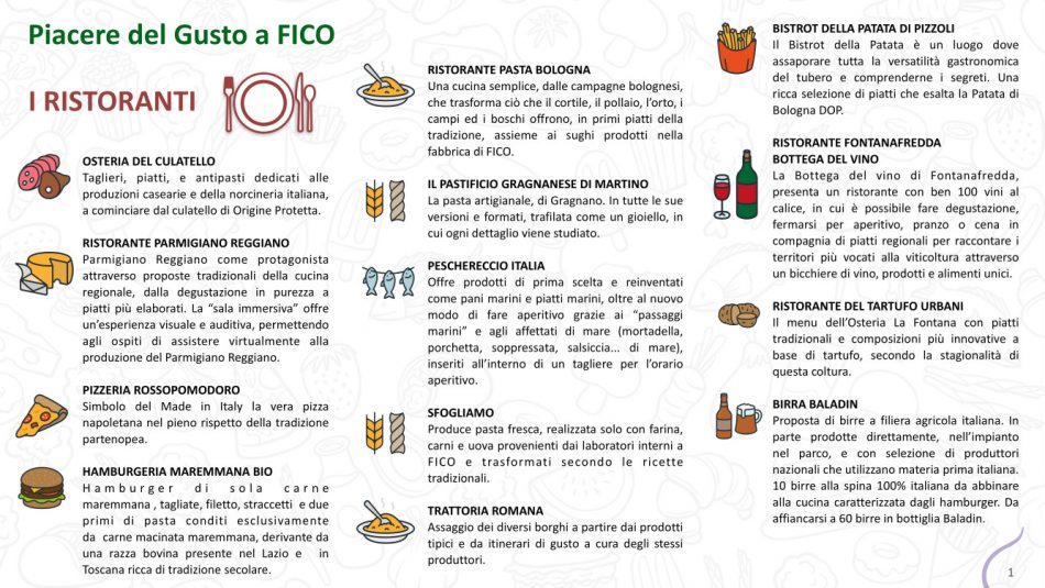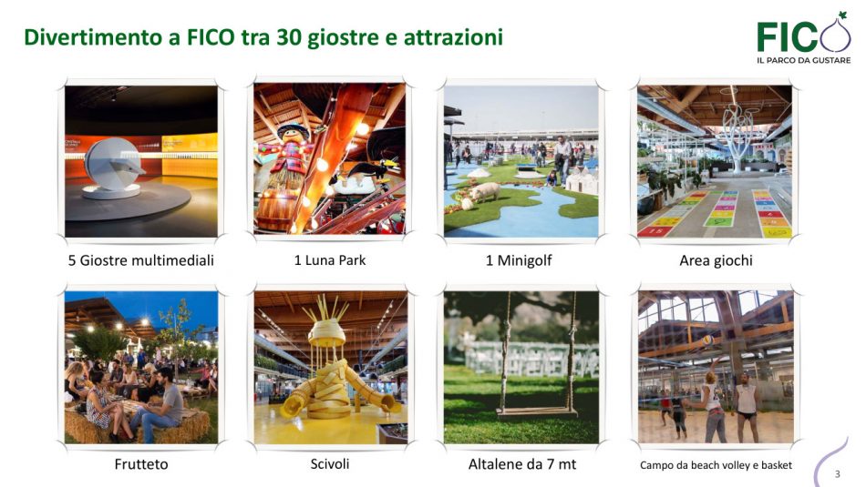 15 gli ettari occupati dal parco, divisi in 7 aree dedicate alle grandi eccellenze italiane (l’Area dei salumi e dei formaggi, della pasta, del gioco e dello sport, del vino, dell’olio, dei dolci) divisi da nuove e spettacolari scenografie ed arricchiti con giochi, giostre ed attrazioni a tema cibo. E ci sarà anche un “luna park contadino”, il Luna Farm, con le sue 14 attrazioni firmate Zamperla, il più grande produttore italiano del settore. Confermati i punti fermi del progetto originale di Fico, che dal 2017 ha raccolto 5 milioni di visitatori: i 60 operatori della filiera agroalimentare, che offrono buon cibo ma soprattutto esperienze a tema, inclusi i grandi Consorzi come Parmigiano Reggiano, Grana Padano, San Daniele, Mortadella Bologna, Aceto Balsamico di Modena e Carne Razza Maremmana Bio. Confermato il progetto Km 0, per cui il cibo prodotto nel parco viene servito in tutti i ristoranti e fra gli operatori presenti. Confermato l’impegno di Fico come parco eco-sostenibile, grazie ai 55.000 mq di impianto fotovoltaico su tetto, uno dei più grandi d’Europa, sistemi avanzati di teleriscaldamento e l’uso estensivo di materiali green e riciclabili.