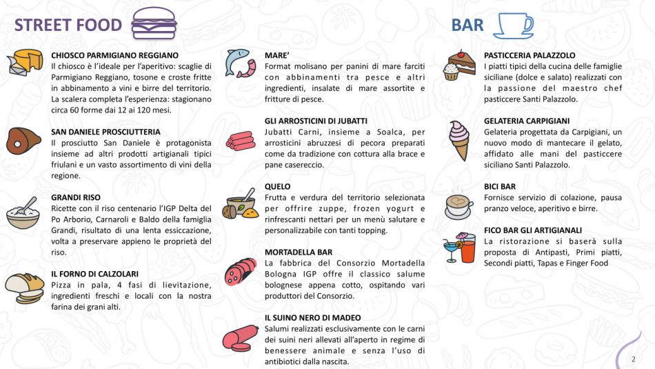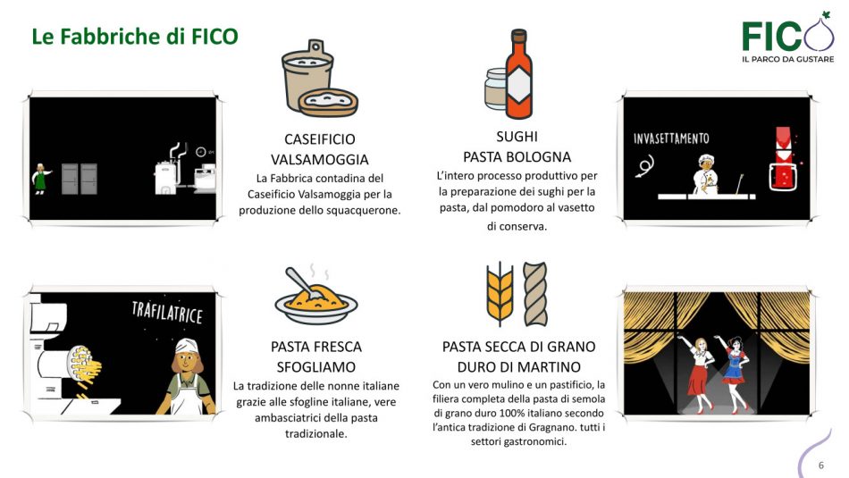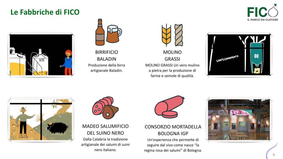 E se il parco resta anche un tempio dello shopping enogastronomico con 2000 metri quadrati di mercato, gestito da Eataly e Coop Alleanza 3.0, e uno spazio congressi, restano punti fermi le 13 “Fabbriche” dedicate a formaggi e pane, paste e sughi, birra e olio, che da luoghi di produzione e didattica diventano anche luoghi di intrattenimento multimediale avanzato, così come le cinque giostre multimediali che raccontano il rapporto tra uomo e cibo: la giostra del Fuoco, della Terra, del Mare, degli Animali, e Dalla Terra alla Bottiglia.