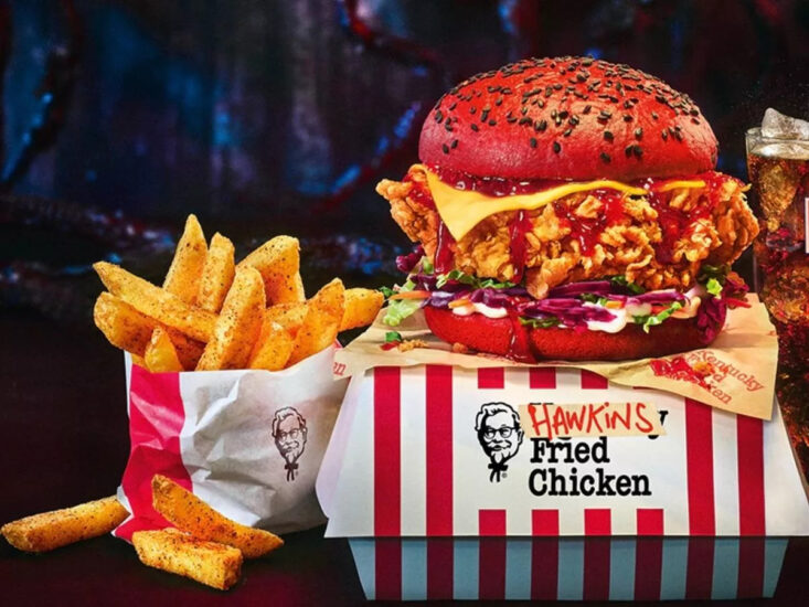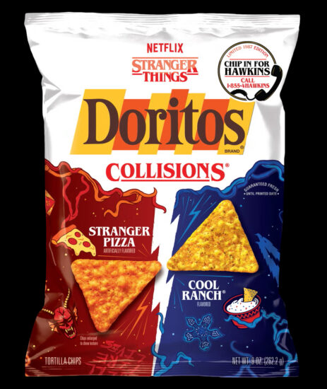 E se McDonald’s ha lanciato (solo in Spagna e Portogallo) l’Happy Meal customizzato e con un giocattolo da collezione in edizione limitata (sei i personaggi, ovvero il Demogorgone, Mike, Undici, Dustin, Will e Lucas), la catena di fast food Kfc ha lanciato, in Uk e in Irlanda, uno spot e due prodotti limited edition: nello spot il brand Kfc (Kentucky Fried Chichen) si trasforma in Hfc (Hawkins Fried Chicken), e vede protagonisti i dipendenti del fast food che fanno una consegna nella città assediata dal Sottosopra, schivando ogni pericolo. Ma non mancano i prodotti limited edition, ovvero lo “Stranger Things Burger”, caratterizzato dal bun di colore rosso e da una salsa agrodolce e piccante, e le “Stranger Wings”, ovvero una versione adattata delle Hot Wings di Kfc). Invece la collaborazione delle patatine Doritos con “Stranger Things” ha visto la creazione di uno spot (per Spagna e Portogallo), con tre ragazzi chiusi in un supermercato mentre un Demogorgone li sta braccando. Uno decide di sacrificarsi per far fuggire gli altri, distraendo il mostro con un pacchetto di croccanti patatine. Non manca anche qui la limited edition, ovvero le “Stranger Pizza x Cool Ranch” Collisions.