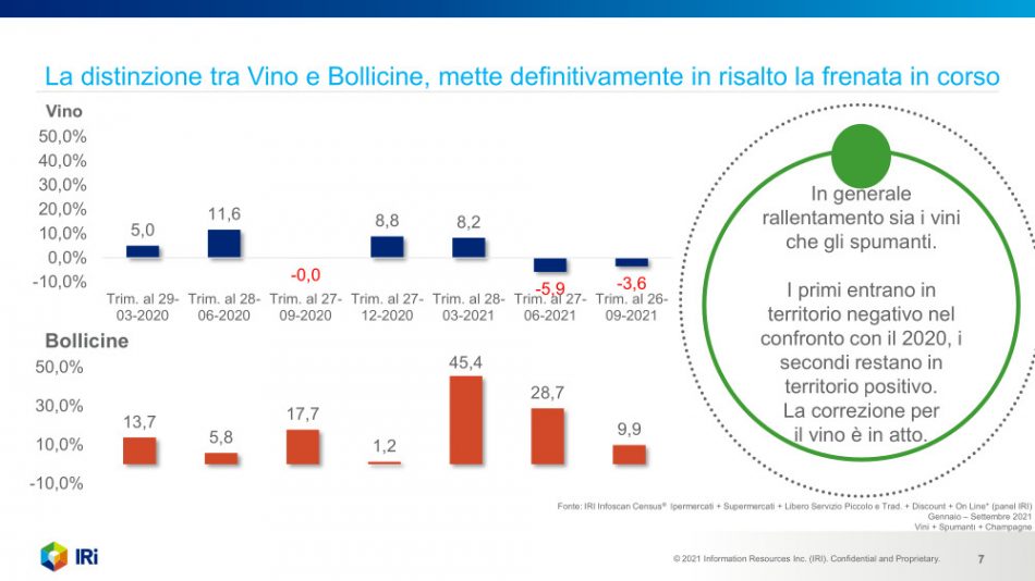 Nei primi 9 mesi del 2021 le vendite di vino e bollicine sono aumentate del 2% a volume e del 9,7% a valore: sono stati venduti 12 milioni di litri in più, sullo stesso periodo 2020, e incassati 200.000 euro in più. Le bottiglie Doc da 0,75lt sono cresciute del 4,8% a volume (+10,8% a valore), quelle Igp del 3,6% (a valore +8,1%). In calo le vendite a volume dei brik (-5,6%), del bag in box (-2,4%), dei vini confezionati in plastica (-14,3%). Le bottiglie da 0,75 lt di vino e bollicine della Marca del Distributore crescono del 3,0% (+6,0 a valore), ma calano nel dato globale del 2,9% (+0,9% a valore). Va sottolineato che le vendite delle bollicine (+27,1% a volume) trainano l’intero comparto dei vini nella Distribuzione Moderna, ma anch’esse si stanno assestando dopo il 2020, passando da un +45% a volume del primo trimestre 2021 al +28,7% del secondo e al +9,9% del terzo. Un discorso a parte va fatto per l’on-line, una canale ancora piccolo nella Distribuzione Moderna, con una quota di mercato a volume dello 0,9%, ma che cresce di più del 50% rispetto al 2020 e del triplo rispetto al 2019. Al netto di un quadro oggi positivo, nel complesso, però, “il trend parla di un rallentamento, e qualche preoccupazione per il canale Gdo in vista della fine dell’anno ed in particolare del mese di dicembre, soprattutto a confronto di uno stesso periodo che nel 2020 è stato eccezionale con le festività passate sostanzialmente tutti a casa, e con gran parte dei consumi che sarebbero stati nell’horeca spostati tra le mura domestiche”, ha detto Virgilio Romano. Ma a preoccupare è soprattutto quello che succederà a partire dal 2022.