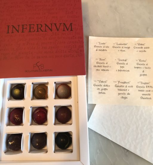 A racchiudere il senso dell’omaggio da parte del mondo del vino, è la limited edition d’artista di Sagrantino di Montefalco di Caprai la cui etichetta è un’opera dell’artista canadese Rick Rojnic che reinterpreta in chiave contemporanea il ritratto di Dante del ciclo di affreschi con le “Storie della vita di San Francesco” dipinte nel Quattrocento dal pittore rinascimentale Benozzo Gozzoli, e la cui vendita contribuisce a finanziare opere per la valorizzazione del patrimonio artistico e culturale di Montefalco con il progetto #Caprai4love, grazie al quale l’antico ritratto del poeta è stato restaurato. E se l’Italia del vino può vantare tra i suoi produttori i discendenti dello stesso Dante, i Serego Alighieri con le Possessioni Serego Alighieri in Valpolicella, dediche al poeta arrivano dai territori legati alla sua vita. Come la Toscana, dove il Brunello di Montalcino celebra il Poeta con “700”, un’edizione speciale del Poggio Cerrino 2015 di Tiezzi per il settecentenario dantesco. E sempre dalla Toscana c’è anche una vera tentazione per i golosi: “Infernvm”, una limited edition - solo 700 scatole numerate - per un percorso di degustazione in nove praline ispirato ai cerchi dell’Inferno, attraverso il cioccolato artigianale della sua isola, l’Elba, della “chocolatier” Paola Francesca Bertani. Senza dimenticare che le “Vie di Dante”, il “cammino slow” da Firenze a Ravenna attraverso i luoghi che Dante attraversò durante l’esilio, è tra le 30 Best in Travel 2021 del mondo per Lonely Planet, unica meta italiana, per la bellezza delle due città d’arte e la natura, ma anche grazie all’enogastronomia. Esilio del quale Dante canta le terre che l’accolsero, tra le Alpi e gli Appennini, il Lago di Garda e lungo il Po, e che sono anche quelle del Grana Padano, le cui “formai de grana” erano presenti sulle tavole già alla sua epoca, e che lo celebrerà al Festivaletteratura di Mantova, il 13 settembre, in occasione dell’anniversario della morte, con il patrocinio del Consorzio. Un’epoca, quella in cui Dante scrive la “Divina Commedia”, in cui il cibo e la sua preparazione iniziano ad avere maggiore presenza nella letteratura e nei ricettari, e si devono anche a questo i diversi riferimenti alla gastronomia nella sua opera. Come per le anguille (“e purga per digiuno l’anguille di Bolsena e al Vernaccia” è il motivo per cui Papa Martino IV si trova tra i Golosi in Purgatorio), che insieme al pesce in gelatina, tipico piatto del giorno delle taverne, i brodetti e la lampreda bollita prima nel vino poi arrostita con erbe e spezie, sono protagoniste del menu medioevale con i piatti di pesce dell’epoca di Dante ricostruito da Fedagripesca-Confcooperativa, quando le tecniche di conservazione e lavorazione erano altre, ma non i sapori. Con un tributo al Sommo Poeta che, tra vino e arte, arriva anche dall’“Enoarte”, la tecnica di pittura con il vino rosso al posto del colore di Elisabetta Rogai, artista fiorentina nota a livello internazionale, il cui ultimo quadro è ispirato a Dante e alla “Divina Commedia”: “Dante infernale”.