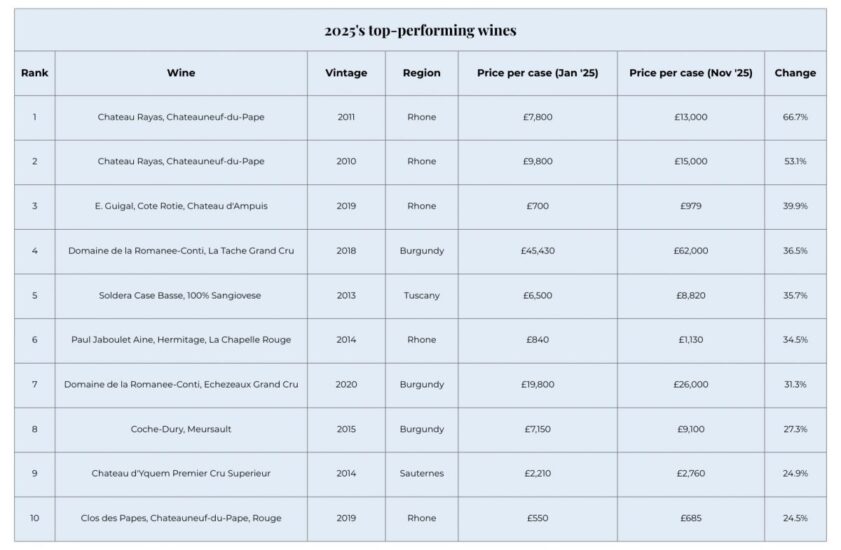 Un podio dominato dal Rodano con Château Rayas al n. 1 con il suo Châteauneuf-du-Pape 2011 che segna una performance, da gennaio a novembre 2025 del +66,7% (equivalenti a 13.000 sterline a cassa), stessa etichetta, ma vendemmia 2010, al n. 2 (+53,1%, 15.000 sterline a cassa) del ranking (i prezzi hanno reagito in modo molto deciso alla scomparsa del proprietario Emmanuel Reynaud a novembre), davanti al Cote Rotie Château d’Ampuis 2019 di E. Guigal che ha registrato un rialzo del 39,9% (979 sterline a cassa). Posizione n. 4 per Domaine de La Romanée-Conti La Tâche Grand Cru 2018, mito della Borgogna (+36,5%, 62.000 sterline a cassa), e n. 5 per l’unico vino italiano, il Soldera Case Basse 100% Sangiovese 2013 (+35,7%, 8.820 sterline a cassa), gioiello di Montalcino e della Toscana enoica, e che continua la propria brillante performance (era n. 10 nel ranking del primo semestre), tanto che nell’ultimo decennio i suoi prezzi sono aumentati di un +224%, ben al di sopra di quelli dei Supertuscan. Questa la top 5 dei vini più performanti del 2025 (da gennaio a novembre) secondo WineCap, realtà specializzata nei fine wines, e che afferma come le performance migliori dell’anno si siano concentrate in poche regioni chiave. Il Rodano ha dominato la classifica con il 50% dei vini top, seguito da Borgogna (30%), Toscana (10%) e Sauternes (10%).
