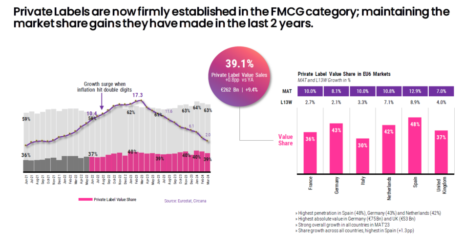 In un’era di calo dei consumi di ogni genere, legati a crisi economiche ed internazionali, inflazione e perdita del potere di acquisto, c’è chi, al contrario, cresce, ed è la marca del distributore, che proprio grazie alla capacità di coniugare sempre più qualità, percepita dal consumatore, e convenienza economica, in alcuni casi supera anche la marca privata nei beni di largo consumo, alimentari in testa. A dirlo è una ricerca Circana, che rileva come, nei 6 principali mercati Ue (Francia, Germania, Italia, Paesi Bassi, Spagna e Regno Unito), nei 12 mesi terminati a marzo 2024, la Mdd sia cresciuta del 9,4% nei valori di vendita (a 262 miliardi di euro complessivi, di cui 75 in Germania e 53 nel Regno Unito) e del 2,2% in volume, raggiungendo una quota di mercato del 39,1% in valore (in aumento del +0,8% e del 46% in unità vendute). In un rapporto che evidenzia come “la Mdd abbia saputo capitalizzare il cambiamento nelle abitudini di consumo, offrendo prodotti accessibili e di alta qualità, in linea con le richieste in continua evoluzione verso scelte di benessere, sostenibilità e valore”.