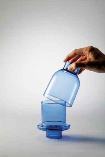 Bluin risolve il rapporto tra il bicchiere d’acqua e quello da vino con una forma che si presenta come unica e, a sorpresa, ne accoglie e disvela due, pronte all’uso in un gesto nuovo. Solitamente la coppia “acqua e vino” si presenta sulla tavola da separata, con un accostamento di forme che non connettono nell’intimo il rapporto tra le due bevande della nostra quotidianità. Bluin è un oggetto protagonista sulla scena ed è composto da due parti davvero complementari, che si integrano con equilibrio in un unicum tra forma e significato, sottolineato dalla trasparenza del vetro color bluin.