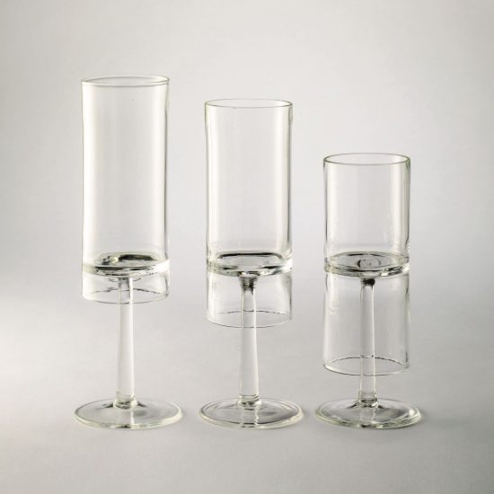 Si sviluppa attorno a una forma cilindrica che si muove leggera lungo il suo asse centrale e si ferma ad altezze diverse per dare vita a tre calici dalla capacità differenziata, pensati per acqua, vino e digestivo. Il progetto si presenta come una efficace riflessione sulla riduzione formale dell’oggetto bicchiere. E la pulizia del disegno viene sottolineata dalla trasparenza del vetro, lavorato a lume, che rivela il “meccanismo” del calice ponendo in evidenza tutti i suoi componenti.