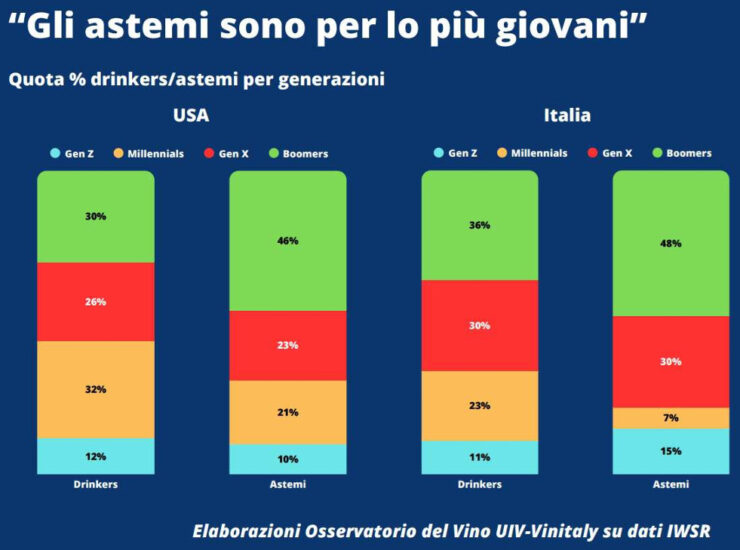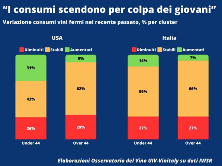 In conclusione, spiega la ricerca, l’industria vitivinicola, e quella italiana in particolare, ha finora fatto fatica a prendere le misure alle generazioni più giovani, per motivi legati alla difficoltà di rendere coerenti gli eterogenei elementi che le spingono ad approcciarsi all’alcol in generale e al vino in particolare. Dall’altra parte, però, pur in mancanza di un quadro certo, del lavoro si è indubbiamente fatto, visto che le giovani generazioni stanno dimostrando di essere parte proattiva dei consumi, compensando in parte le erosioni volumiche (ma soprattutto valoriali) di alcune tipologie di vino, che altrimenti sarebbero catastrofiche. I Millennial e soprattutto i Gen Z sono consumatori che hanno più di un decennio davanti a sé, e già scalpita la nuovissima generazione degli Alpha. I segnali (deboli, ma fino a un certo punto) inviati al settore sono molteplici, solo che a differenza dei genitori e dei nonni, vanno in svariate direzioni, a volte risultando contraddittori. Questo patrimonio, evidenziato dai numeri di questo rapporto, è un punto di partenza importante per intanto sgomberare il campo dai luoghi comuni, ma soprattutto per imbastire con gli “adulti di domani” una relazione duratura e profittevole. “Di sicuro, negli anni a venire, il settore vitivinicolo andrà incontro a riduzioni (e conseguenti ristrutturazioni) delle produzioni, il che implica un’opera di reindirizzamento costante, a livello produttivo, stilistico, di comunicazione. Saranno anni sfidanti, sicuramente, che metteranno a dura prova le imprese, chiamate a fare quel salto che in anni passati ha riguardato meramente la qualità del vino, ma che ora deve necessariamente ricomprendere una sfera più olistica del fare azienda”, conclude l’Osservatorio del Vino Uiv-Vinitaly.