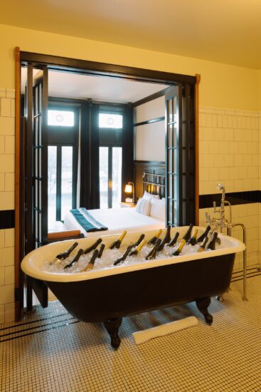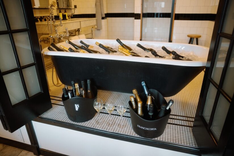 Cibo e bevande si muovevano per l’hotel come una performance parallela, mentre il Franciacorta veniva versato da bottiglie raffreddate in vasche da bagno retrò, perché se si ha intenzione di occupare un hotel con Maurizio Cattelan, tanto vale usare l’impianto idraulico.