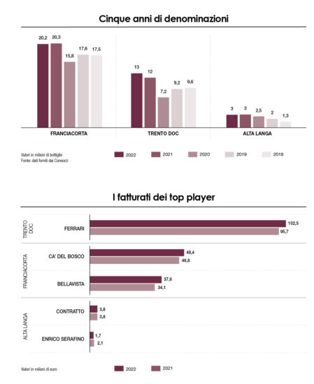 Per fatturato solo Ferrari (Trento Doc) è oltre i 100 milioni, ma Cà del Bosco (con 49,4 milioni di euro) e Bellavista (37,6 milioni di euro), entrambe in Franciacorta, sono competitive. Enrico Serafino e Contratto, brand dell’Alta Langa, rappresentano ancora realtà di nicchia.