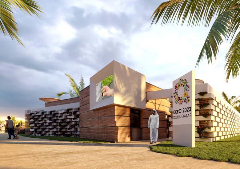 Un Padiglione progettato e concepito per esporre e descrivere un’agricoltura orizzontale e verticale da applicare alle metodologie tradizionali in luoghi inospitali, in uno spazio tutto sommato contenuto, con 590 metri quadrati di spazio, di cui il 20% al coperto, con un’area esterna con un “recinto” coltivato attraverso processi idroponici, realizzato con frangisole sovrapposti e vaschette in polistirolo strutturale di colore bianco, alternate tra di loro, per ricordare il graticcio di mattoni tipico delle case rurali. Ogni vaschetta è stata pensata per contenere diverse essenze vegetali, che diventeranno l’ornamento cromatico vero e proprio della facciata. È il concept del Padiglione Italia che sarà di scena ad Expo Doha 2023, rassegna universale specialistica dedicata all’orticultura promossa dal Bureau International des Expositions, in Qatar, dal 2 ottobre 2023 al 28 marzo 2024. “Green Desert, Better Environment” è il filo conduttore di questa esposizione, con l’obiettivo di illustrare le tecniche che consentono la coltivazione sostenibile di alberi e colture in terre aride e che sono indispensabili per affrontare i problemi di desertificazione in tutto il mondo. 80 Paesi, ad oggi, hanno confermato la loro partecipazione ufficiale, 3 milioni i visitatori attesi.