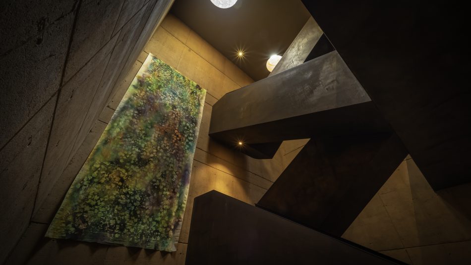 L’opera dunque si presenta come una grande tela, lunga e stretta che è stata cosparsa di pigmenti a secco, ed in seguito, lasciata tra le vigne. Attraverso il contatto con elementi naturali e atmosferici, come il sole, l’umidità, la caduta spontanea di foglie e arbusti, la tela è stata “dipinta” dalla natura e, successivamente, istallata in uno dei due scaloni che attraversano in altezza la struttura. In questo modo, la vita naturale del paesaggio del Chianti Classico entrerà nell’architettura ipogea della cantina, dando vita a una sorprendente crasi tra interno ed esterno, tra natura e architettura contemporanea, trasformandosi metaforicamente in una finestra naturale.