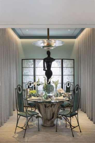 Per celebrare l’arte della tavola, Chahan Minassian allestisce un intimo boudoir immerso in una quiete sontuosa. Il designer francese immagina la sua installazione come un trionfo di oggetti pregiati, alla stregua di una scatola di gioielli, dove la giustapposizione di tessiture variegate, arredi esuberanti e accessori eleganti riflette il gusto eclettico del collezionista-padrone di casa, inevitabilmente attratto dal dettaglio ricercato. In questo stratificato tableau s’incontrano elementi disegnati dallo stesso Minassian, tra cui le abat jour Pyramid, il lampadario in vetro di murano turchese o il monumentale paravento con pannelli in cristallo di rocca, e pezzi storici rari come la scultura Bush di Harry Bertoia della fine degli anni Sessanta, le sedie in stile neoegizio di Horacio Cordero, o come, pièce de résistence dell’allestimento, un tavolo brutalista del designer argentino Hugo Cesar Tonti, con il basamento in bronzo che ricalca il portamento vigoroso delle carnose foglie di agave. Il tablescape mette in risalto la delicatezza del servizio in argento che include secchielli per il ghiaccio, flûte, piatti e posate della collezione Caviar di Buccellati, tempestati di tante piccole sfere unite a formare fasce decorative. Completano la tavola porcellane e bicchieri in vetro soffiato su disegno di Minassian. Il designer presta la massima attenzione ai particolari e alle qualità tattili degli oggetti in uso, perché l’esperienza sia un piacere per gli occhi prima ancora che per il palato.