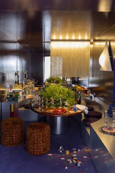 Dimorestudio sceglie un servizio d’argento che si richiama all’antico gusto veneziano e lo trasporta nella sala da pranzo di un appartamento anni Settanta. Blocchi monocromatici in tonalità profonde, aubergine e morbide nuance di marrone, delineano gli spazi e i volumi dell’arredo modulare che conferisce all’ambiente un’allure rétro, mentre piani espositivi integrati permettono di alloggiare opere d’arte e pezzi storici di design. I materiali impiegati instaurano un gioco di contrasti: freddi e levigati come gli specchi e i dettagli in acciaio spazzolato, oppure morbidi e caldi come i rivestimenti delle sedute, la moquette, le fluttuanti frange che ricadono dalle lampade a soffitto. Britt Moran e Emiliano Salci mutuano modi e stili da Maria Pergay, per l’uso di campiture estese e lo styling di argenti e ceramiche, da Nanda Vigo, per le conversazioni materiche, da Pierre Cardin per i raffinati cromatismi, rielaborando i riferimenti storici con un twist personale e contemporaneo. Costruiscono un set di sapore cinematografico, accompagnato da un sottofondo di musica elettronica soft, dove il punto focale è il tavolo disegnato da Salci con piano riattato in legno laccato, sul quale sono organizzate, in modo deliberatamente non rigoroso, le caraffe, i bicchieri, i piatti e le jatte della collezione Doge di Buccellati, connotata dalla commistione tra argento e tagli di lapislazzuli e diaspro rosso.