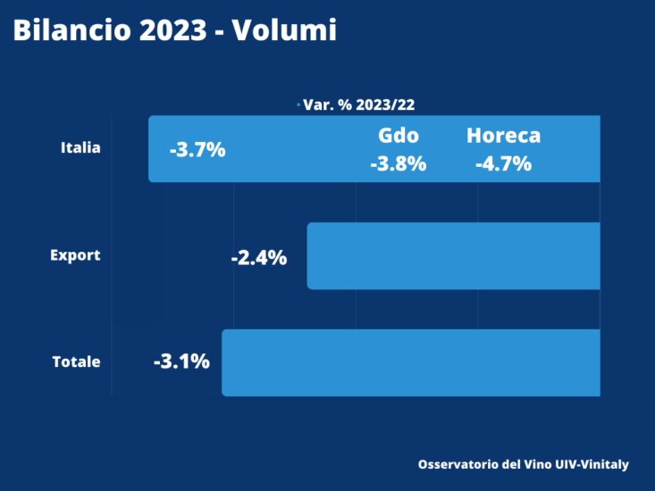 Per il vino italiano il valore globale è sceso a 13,3 miliardi (-2,9% prudenziale) con un fatturato diminuito del 4% (5,6 miliardi) e uno scenario difficile tanto off che on trade. Non basta il ritorno del turismo a tirare su il settore (che, non va dimenticato, era reduce da anni positivi) con un export in calo del 2,2% e che vale 7,65 miliardi. Le riduzioni abbracciano anche i volumi (-3,7%) ed i canali di vendita, e quindi gdo (-3,8%) e horeca (-4,7%). Ad incidere anche il cambiamento climatico che ha di fatto cambiato anche le abitudini di consumo (meno vini rossi) e la difficoltà ad intercettare le nuove tendenze.
