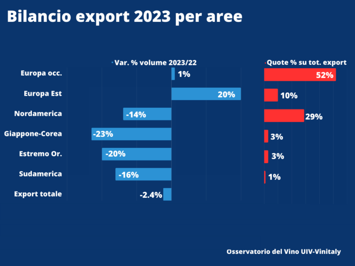 Est Europa e Balcani valgono 307 milioni di euro, pari al 4% della quota export, raggiungendo un +19% in valore nei primi sette mesi del 2023. Paesi come Polonia, Repubblica Ceca, Slovacchia, Romania, Bulgaria, Crozia, Ungheria, Serbia mostrano interesse per il vino italiano con frizzanti e spumanti che trascinano per oltre la metà l’export. La Cina è il “grande malato” del vino (e non solo per l’Italia) con il livello di importazioni sceso sotto quello del 2013. Unica nota positiva è l’orientamento dei consumatori a bottiglie più costose (da 6,5 euro ad oltre 12), trend che ribalta quello di dieci anni fa.