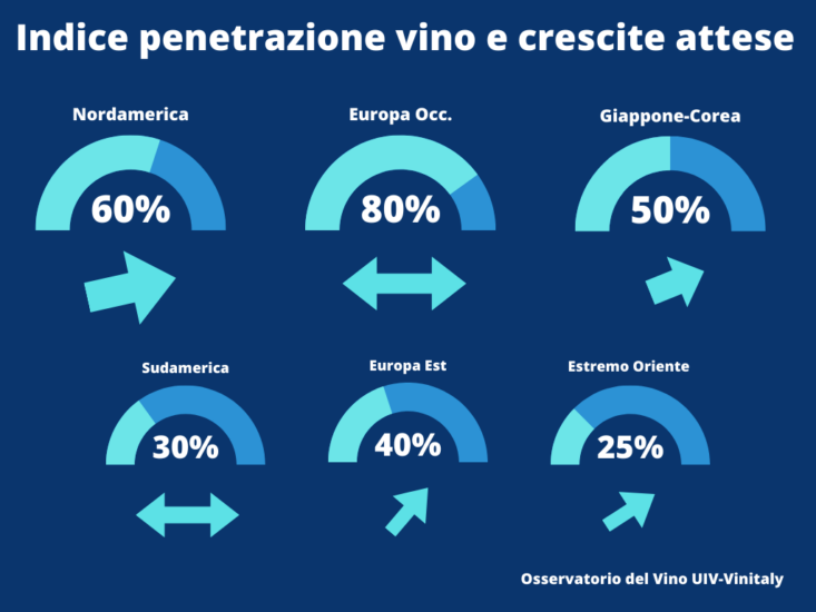 Secondo l’analista, il quadro 2023 se da un lato conferma le difficoltà del vino italiano previste a fine 2022, dall’altro evidenzia la necessità di operare un cambio di passo per rimettere in carreggiata il comparto alle prese con una stagione difficile. Secondo le stime dell’Osservatorio Uiv-Vinitaly, l’anno si chiuderà con un calo del fatturato rispetto al 2022 (-2,9%); la diminuzione dei costi di esercizio per effetto del rientro parziale delle tensioni di energetici e materie prime non è bastata a preservare i fondamentali di un comparto che, come altri, sta scontando in particolare il raddoppio dei tassi di interesse, ma anche un aumento del tasso di insolvenza dell’horeca e un calo del mercato che sta impattando sui costi di magazzino. Su questo fronte, l’Osservatorio Uiv-Vinitaly stima una chiusura d’anno meno drastica di quanto preventivato 12 mesi fa in uno scenario ipotizzato di recessione globale; il calo dei volumi venduti si attesterà poco sotto al 3%, grazie alla tenuta della domanda in Europa Occidentale (+1%) e in parte minoritaria al balzo nell’Est Europa (+20%), a dimostrazione come ci siano ancora mercati con potenzialità da esplorare. Anche se la brutta notizia arriva dai mercati storici, a partire dal Nord America (-14%), passando per Giappone e Corea (-23%), Estremo Oriente (-20%) e Sudamerica (-16%). Nel complesso, il mercato interno cederà 3,7 punti, mentre l’export il 2,4%. Ma ci sono anche segnali positivi, mercati con delle possibilità molto interessanti dove il vino italiano può piantare la propria bandiera. L’Osservatorio Uiv-Vinitaly cita Giappone e Corea del Sud, ma anche l’Est Europa, con indici di penetrazione ancora sotto il 50% del potenziale e con importanti previsioni di crescita. Anche il top buyer Usa, secondo il report, presenta, tutt’oggi, un indice di penetrazione del vino al 60% e una curva che, al di là della congiuntura, si prospetta in rialzo nel medio-lungo periodo (il Nord America vale il 30% dell’export italiano). Per gli Usa, -11,8% a volume nel mondo e -8,7% in Italia, il peggioramento è stato continuo nei trimestri con l’inflazione che ha avuto una grande influenza. E sarà così fino a metà 2024, secondo le previsioni, ma con qualche nota positiva da evidenziare come la crescita del vino italiano (l’unico rispetto ad altri competitor) nel promettente Midwest con una significativa quota di bottiglie che partono dai 25 dollari.