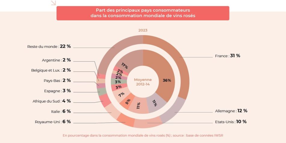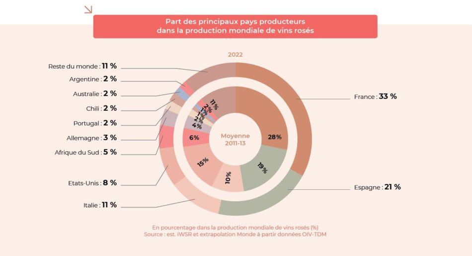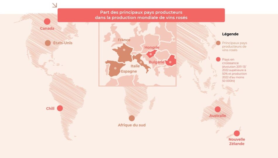La produzione mondiale dei rosé resta, dunque, concentrata in Francia (33% dei volumi nel 2022, contro il 30% nel 2021), Spagna (21%), Italia (11%), Usa (8%) e Sudafrica (5%), ma si affacciano nuovi e dinamici Paesi produttori come Cile, Nuova Zelanda, Australia, Ungheria, Bulgaria e Canada, segno di una crescente internazionalizzazione dei rosati.