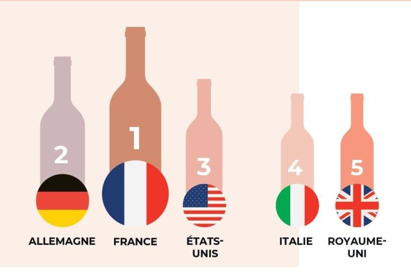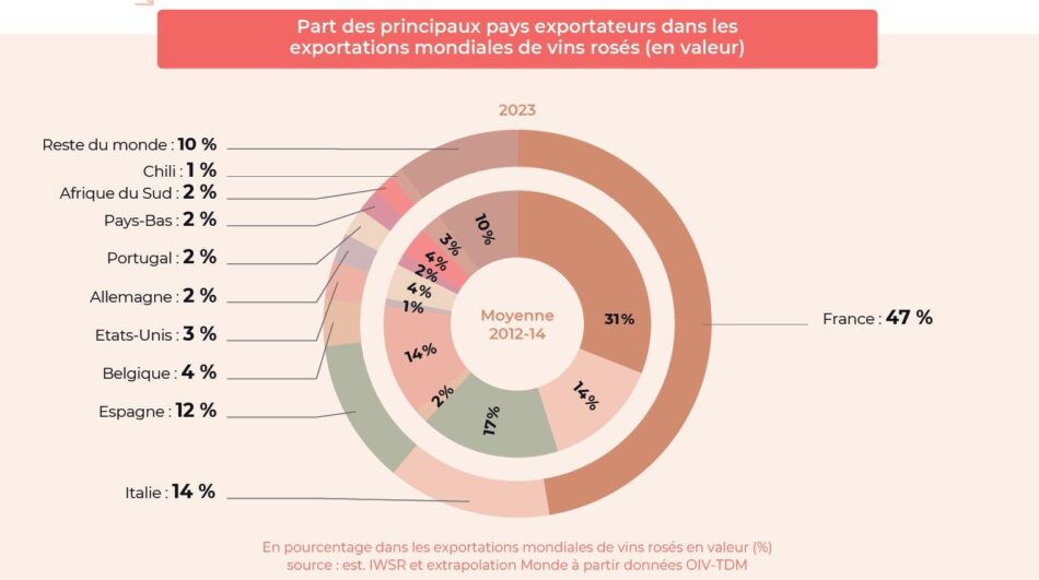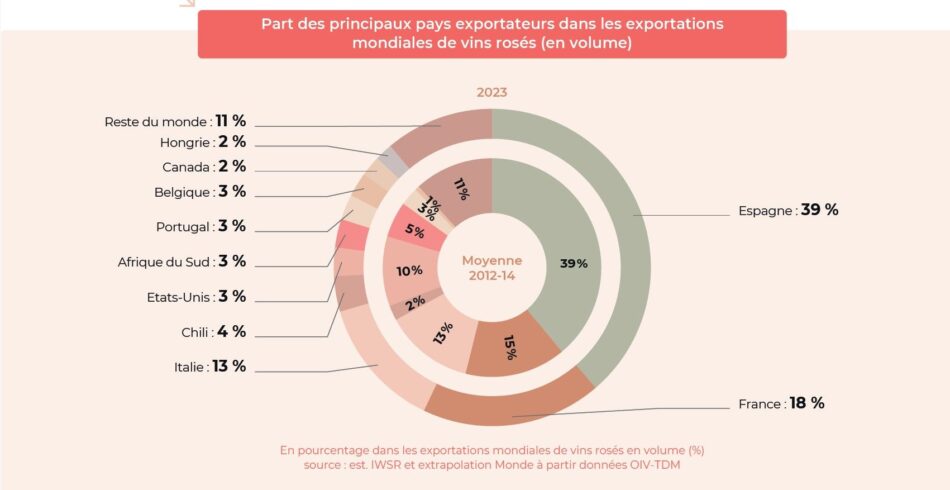 La produzione mondiale di vini rosé si è attestata a 22,5 milioni di ettolitri nel 2022, rimanendo sostanzialmente stabile nel 2023. Il consumo mondiale di rosati ha raggiunto 18,5 milioni di ettolitri nel 2023, pari al 10% del consumo globale di vino. Le esportazioni mondiali della tipologia, invece, sempre nel 2023, ammontano a 10,8 milioni di ettolitri, con la Spagna leader in volume (39%), seguita da Francia (18%) e Italia (13%), mentre la Francia domina in valore (47%), davanti a Italia (14%) e Spagna (12%), grazie ad un prezzo medio di 4,4 euro a bottiglia e un valore totale di 2,5 miliardi di euro, quasi raddoppiato dal 2014 (1,3 miliardi di euro). È la fotografia scattata dal “Rapporto dell’Osservatorio Mondiale del Rosé” 2025 su dati 2023, pubblicato dal Conseil Interprofessionnel des Vins de Provence (Civp) e FranceAgriMer.