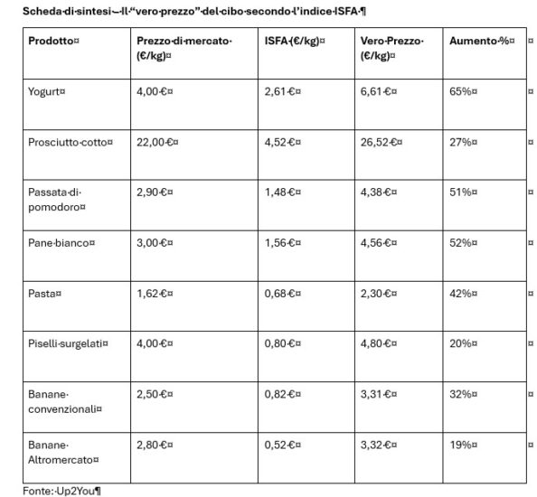 I dati, basati su medie di settore e letteratura scientifica, mostrano differenze significative tra filiere complesse ed energivore, come latticini e carni, e filiere più corte e sostenibili. Lo yogurt, ad esempio, non costa 4 euro al chilo, ma 6,61 (+65%); la pasta presenta un costo nascosto del +42%, passando da 1,62 euro a 2,30 euro; la passata di pomodoro sale da 2,90 a 4,98 euro (+51%); il pane bianco da 3 a 4,56 euro (+52%); mentre il prosciutto cotto supera i 4,50 euro al chilo di costi esterni, con un aumento del +27% sul prezzo di mercato di 22 euro. Anche le banane convenzionali mostrano un extra costo del +32%, che scende al 19% nel caso delle banane Altromercato, grazie a pratiche più sostenibili. Tra i prodotti più virtuosi, i piselli surgelati, con un costo nascosto di soli 0,80 euro al chilo (+20%).