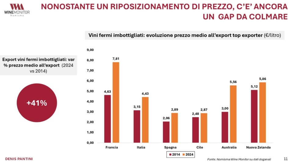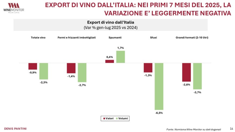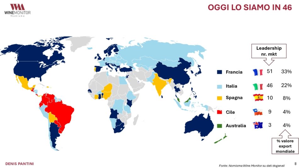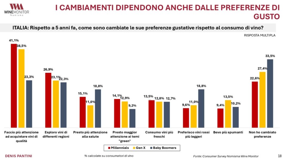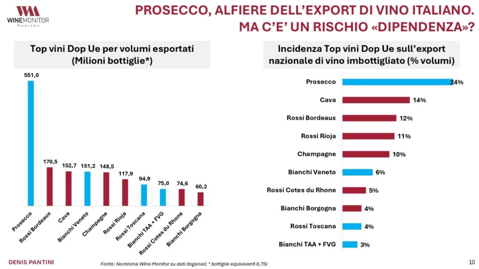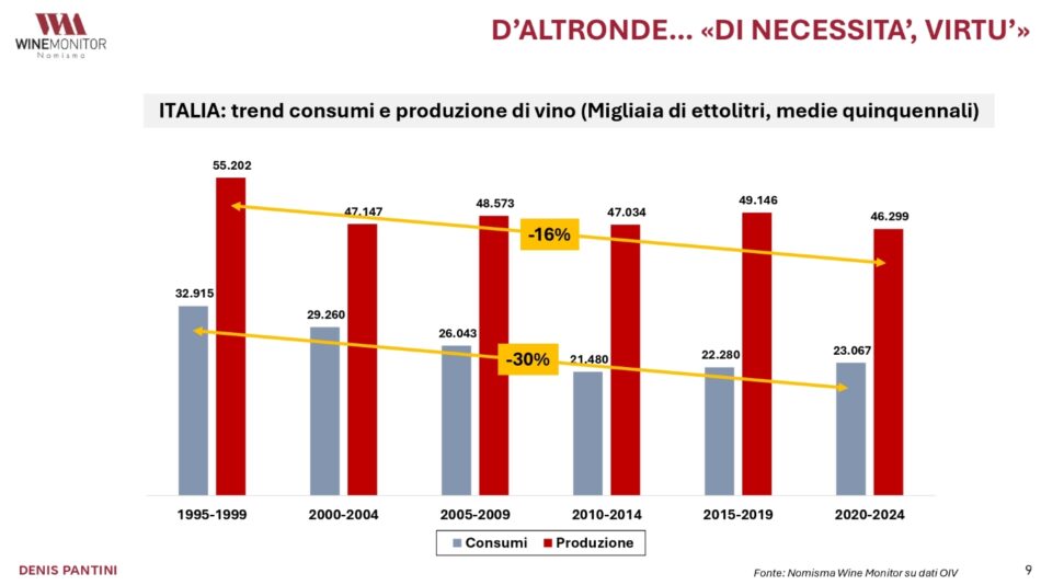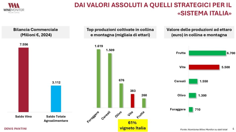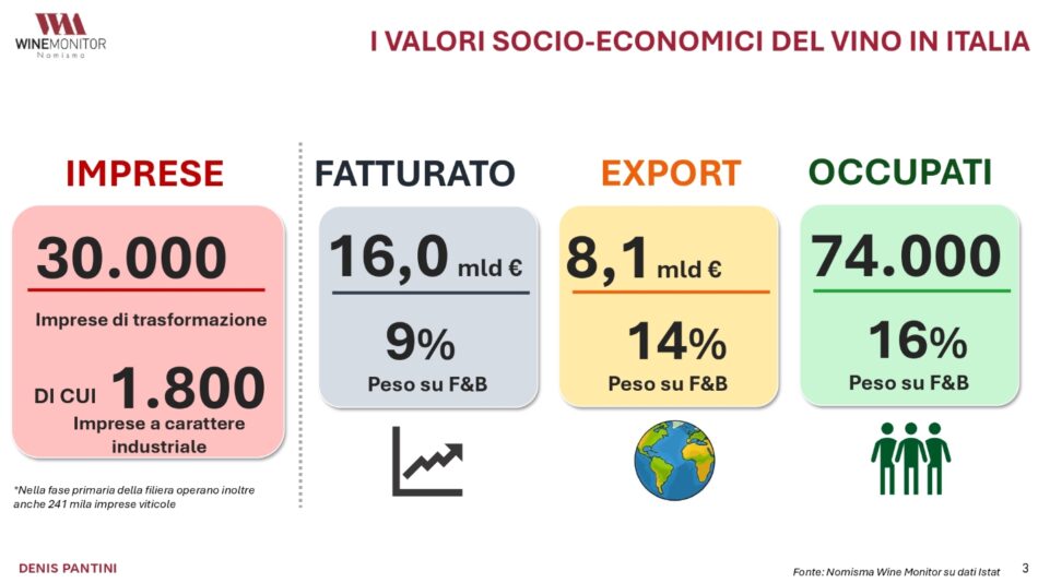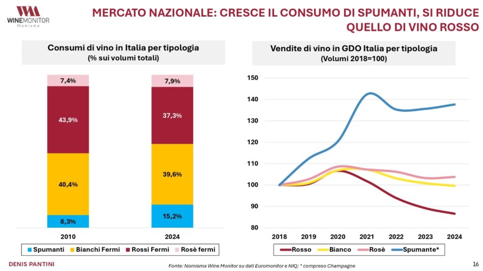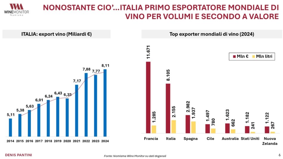 E che hanno commentato l’indagine “Il vino italiano tra eccellenze e sfide globali” illustrata da Denis Pantini di Wine Monitor - Nomisma. Da cui è emersa la forza di un settore fatto da 30.000 imprese, 16 miliardi di euro di fatturato, 8,1 miliardi di euro di export e 74.000 occupati (il 16% del food & beverage), con una bilancia commerciale in attivo di 7,5 miliardi di euro (sui 3,2 di tutto il comparto agroalimentare), che vede la vigna tra le colture più redditizie (5.500 euro per ettaro, dietro solo alla frutta con 6.700 euro per ettaro), fondamentale per il mantenimento delle aree interne, anche grazie all’enorme indotto enoturistico. Una filiera fatta di grande biodiversità (i primi 10 vitigni coltivati fanno il 38% del totale, contro l’80% dell’Australia o il 71% delle Francia, per esempio), che è ricchezza, ma anche frammentazione, come è frammentato il sistema delle imprese, con le prime 100 per giro d’affari che rappresentano il 55% del fatturato ed il 65%. Un settore, quello del vino italiano, che è cresciuto tanto nel mondo, visto che nel 2014 si esportavano poco meno di 5 miliardi di euro e nel 2024 siamo arrivati a 8,1, con il vino italiano che 20 anni fa era leader in soli 9 mercati contro i 41 della Francia, mentre oggi i transalpini, che pesano per il 33% dell’export di vino mondiale, sono primatisti in 51 Paesi, con l’Italia al vertice in 46, con i vini del Belpaese che fanno il 22% del giro d’affari all’export. E questa è stata una risposta anche al calo dei consumi interni, dal 1995 ad oggi calati del 30%, a 23 milioni di ettolitri, con la metà della produzione (46 milioni di ettolitri, anche questa in calo), ma solo del -16% dai 55 del 1995, che finiscono nel mondo, anche se in maniera molto concentrata, visto che il 24% è rappresentato dalla locomotiva Prosecco. Nondimeno, però, anche se ancora di strada ce ne è da fare, è cresciuto anche il prezzo medio del vino imbottigliato, a 4,4 euro al litro (+41% in 10 anni), contro, però, i 7,8 euro al litro della Francia o i 5,5 euro al litro dell’Australia, per esempio. Un vino italiano che, venendo ad oggi, sembra tenere nelle esportazioni 2025 almeno fino a luglio (-0,9%, contro il -0,5% della Francia, il -1,8% della Spagna, il -4,3% del Cile, il -8,5% dell’Australia e addirittura il -29,2% degli Stati Uniti, per l’effetto dei contro dazi in Canada e Cina, principali mercati). E che vede un cambio nei suoi consumi interni, con spumanti (15,2%, quasi il doppio sul 2010) e bianchi fermi (39,6%, sostanzialmente stabili per quota di mercato), che hanno sopravanzato i rossi (oggi al 37,3% dal 43,9% del 2010), anche perché sono diminuiti di molto i consumatori quotidiani, che hanno nel vino rosso la categoria più consumata (32%). Con un consumatore odierno che, ha spiegato Pantini, guarda con maggiore interesse alla qualità, alla sostenibilità, ma anche a vini più freschi, meno alcolici e così via. Per un vino italiano che fai conti con alcuni mega trends: il cambiamento climatico, la crescita sempre più forte dell’innovazione tecnologia e dell’Intelligenza Artificiale, ma anche il tema della geopolitica, con mercati emergenti che guardano sempre più all’Italia come Sudamerica, Est Europa e Sud Est asiatico.