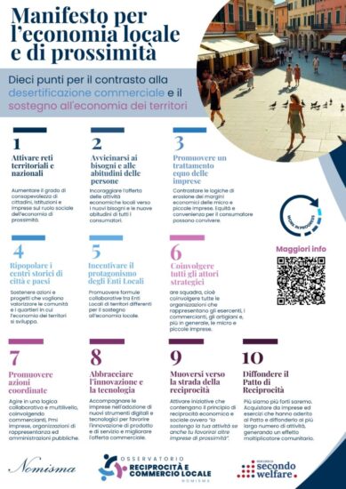 Oltre 86.000 negozi di vicinato scomparsi negli ultimi 10 anni, con un saldo negativo che supera le 106.000 unità rispetto al picco del 2018. È la fotografia “preoccupante” scattata dall’Osservatorio Reciprocità e Commercio Locale di Nomisma, edizione n. 1 realizzata con Percorsi di Secondo Welfare, e presentato, nei giorni scorsi a Bologna. “Un segnale evidente di città che si svuotano, di relazioni che si indeboliscono e di comunità che rischiano di perdere i propri tradizionali punti di riferimento. Il declino del commercio locale non riguarda soltanto l’economia, ma incide direttamente sulla qualità della vita urbana e sulla coesione sociale dei territori”, spiega Nomisma che, per combattere queste dinamiche ha rilanciato il “Manifesto della Reciprocità”: un opportunità per riflettere e individuare soluzioni su scala nazionale e locale attraverso la messa a terra di 10 punti programmatici e che si propone come strumento di sensibilizzazione e coinvolgimento di stakeholder e amministrazioni locali con un approccio primariamente sociale e orientato alle comunità.