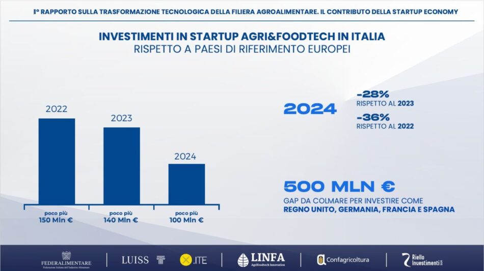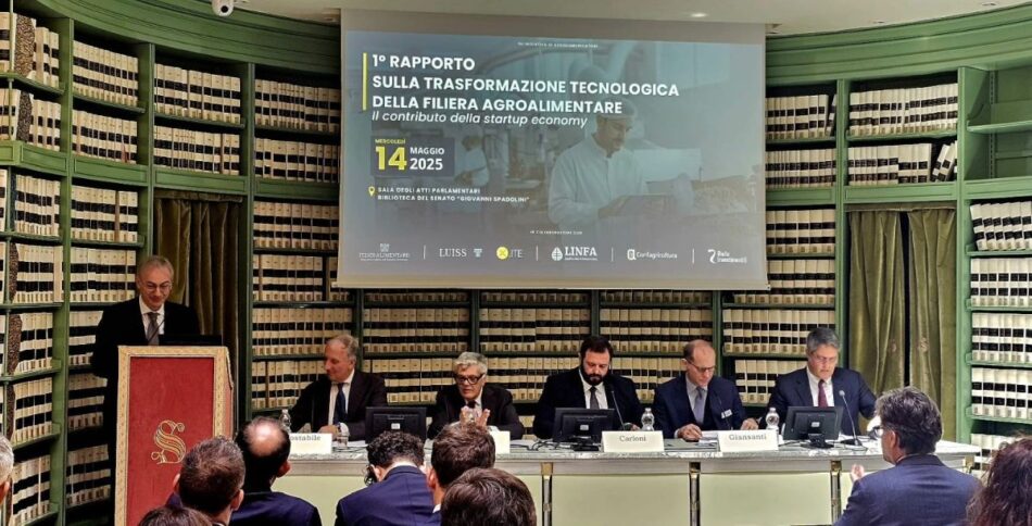 Nonostante l’agroalimentare rappresenti circa il 30% del Pil italiano, nel 2024 gli investimenti in startup Agri & FoodTech si sono fermati a poco più di 100 milioni di euro, in calo dai 140 milioni del 2023 e dai 150 milioni del 2022, un trend negativo che segna un -28% su base annua e un -36% rispetto ai due anni precedenti, e solo in parte attribuibile all’emergenza Covid, che nel 2022 aveva spinto gli investimenti su startup in grado di innovare il mondo del commercio e dei servizi legati al cibo. Il confronto con altri Paesi europei è impietoso: Regno Unito, Germania, Francia e Spagna investono molto di più, e, per colmare il divario, in rapporto al valore della produzione agricola, l’Italia dovrebbe quintuplicare gli investimenti rispetto al dato reale del 2024, portandoli ad almeno 500 milioni di euro annui. Ecco che un’inversione di questo trend e un deciso cambio di passo è divenuto ormai urgente, anche per accelerare l’integrazione delle startup nei processi economici della filiera coinvolgendo piccole, medie e grandi imprese che già operano sui mercati nazionali e internazionali. Sono le evidenze del “Rapporto sulla Trasformazione Tecnologica della Filiera Agroalimentare. Il contributo della Startup Economy” n. 1, presentato oggi, al Senato a Roma, ed esito di un progetto promosso da Federalimentare, sostenuto da Confagricoltura e realizzato dal Centro di Ricerca Luiss-X.Ite, con la collaborazione degli esperti di Linfa AgriFoodTech Fund.