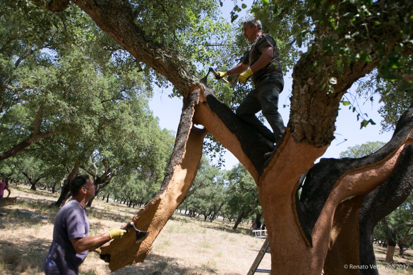 A cavallo tra la primavera e l’estate, infatti, la linfa si posiziona tra il fusto della pianta e la sua corteccia, ed è quindi possibile toglierla agevolmente, con un abile movimento che può essere praticato solo da mani esperte. La decortica risulta essere proprio per questo tra i lavori agricoli più ben pagati al mondo, perché sono in pochi a possedere le competenze e la manualità necessarie, che ne fanno un’attività economicamente fondamentale per le comunità del sud del Portogallo e della Spagna. E sostenibile, anche in termini ambientali: la decortica offre un importante contributo contro la desertificazione delle foreste del nord Africa e del sud Europa, dato che la quercia da sughero è l’unica pianta in grado di sopravvivere in un suolo povero e con poca acqua.
