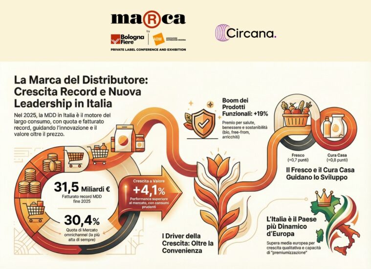 La Marca del Distributore è il motore trainante dell’economia italiana del Largo Consumo: è la certezza con la quale “Marca by Bolognafiere & Adm” 2026, edizione n. 22, si è conclusa, ieri a Bologna. A confermarlo, dopo le elaborazioni di Teha (The European House-Ambrosetti), è stato il “Rapporto Marca sull’evoluzione della Mdd” n. 22 realizzato da Circana, un’analisi che ha evidenziato un cambio di paradigma sostanziale per il settore: ovvero che il consumatore non cerchi più solo, semplicemente, il “primo prezzo”, ma premi anche la qualità e i valori di filiera della Mdd con il segmento dei prodotti funzionali (bio, free-from, arricchiti) che si è rivelato il vero protagonista dell’anno, forte di una crescita a doppia cifra del +19% a valore.