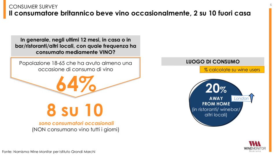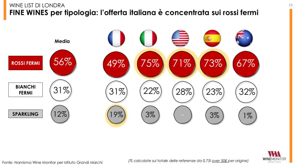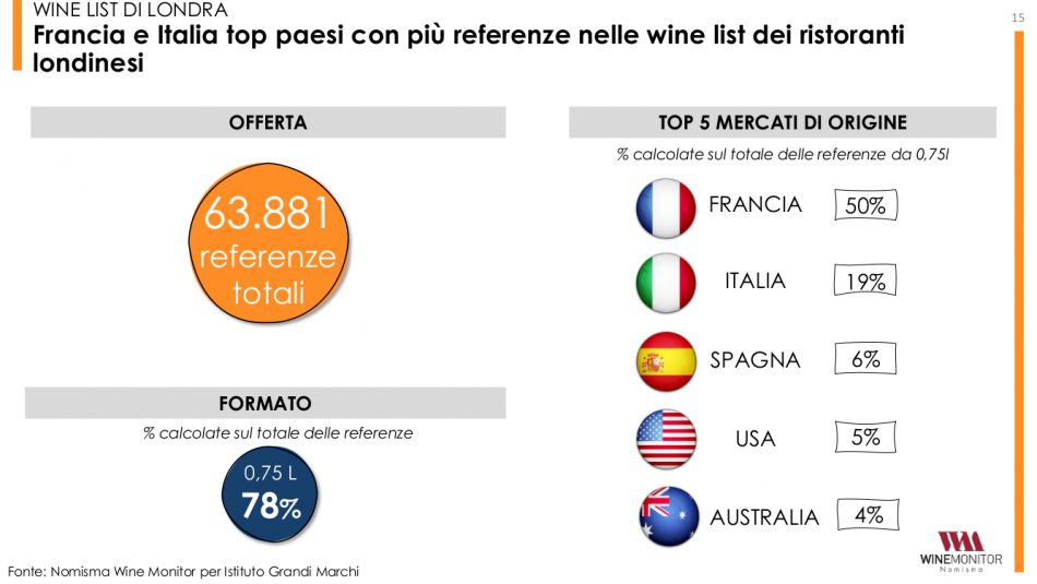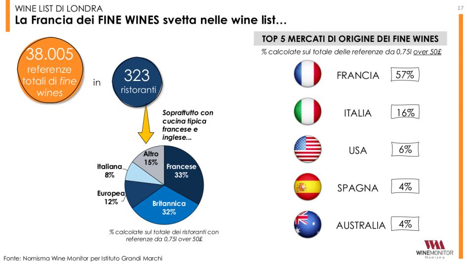 Non a caso, l’indagine di Wine Monitor per l’Istituto Grandi Marchi si concentra anche sulle principali dinamiche legate alla ristorazione inglese ed all’e-commerce (che, nel Regno Unito, vale oltre il 10% delle vendite di vino), che, per le top label italiane, rappresentano due “piazze” decisive per intensificare le vendite. Basti pensare che analizzando 350 ristoranti, rappresentativi del canale on-trade di Londra, il 63% di essi ha almeno un’etichetta top italiana nella lista dei vini (considerando le sole bottiglie da 0,75 sopra le 50 sterline). Secondo i dati, i fine wines tricolore rappresentano complessivamente il 16% di tutte le referenze con prezzo superiore a 50 sterline presenti nelle wine-list analizzate. A superarci solo la Francia che detiene il 57% sul totale delle bottiglie over 50 sterline presenti. Guardando ai vini italiani nel complesso, il rapporto è del 19% contro il 50% francese. Toscana e Piemonte rientrano nella top 10 dei territori di origine più presenti (rispettivamente al 5° e 7° posto nella classifica dei vini top).