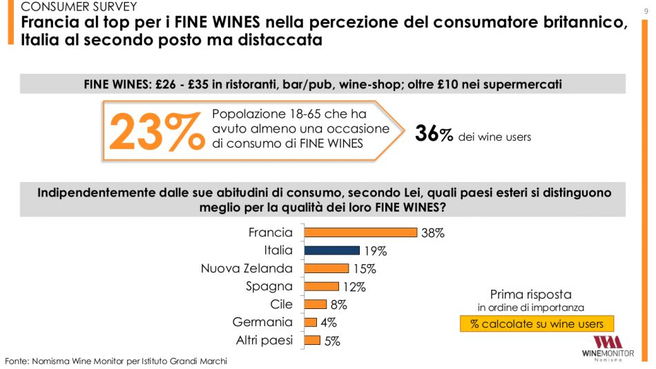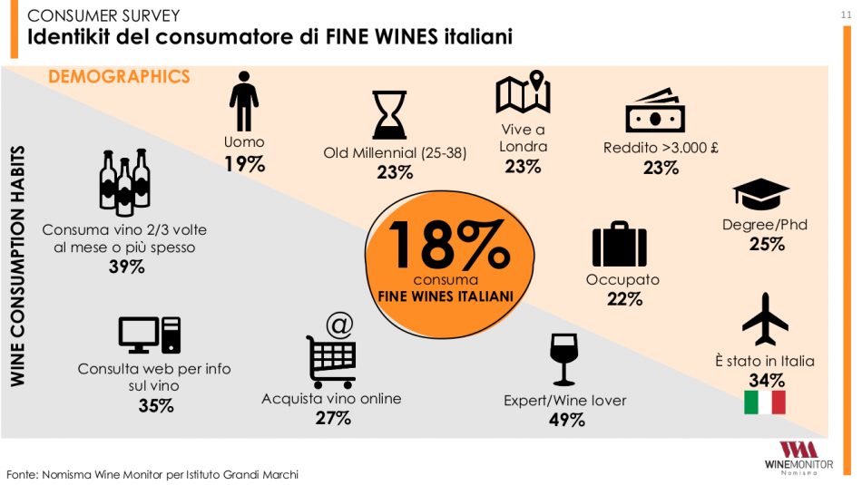 “In uno scenario di possibile aumento dei prezzi - ha chiarito Denis Pantini, responsabile di Nomisma Wine Monitor - la qualità risulta l’unico fattore in grado di mantenere invariati i consumi. Tant’è vero che lo pensa il 20% degli inglesi. Percentuale che cresce fino al il 23% tra i consumatori di vino italiano e arriva al 27% tra chi oggi è già fruitore di top label provenienti dal nostro Paese”. Interessante lo spaccato sul consumatore inglese di fine wine italiani: prevalentemente uomo, tra i 25 ed i 38 anni, londinese, con un reddito superiore alle 3.000 sterline al mese, e con un alto livello di istruzione. Con una spiccata propensione al web sia per informarsi che per acquistare vino, e che ha viaggiato in Italia, da cui emerge una preferenza per Toscana e Sicilia.