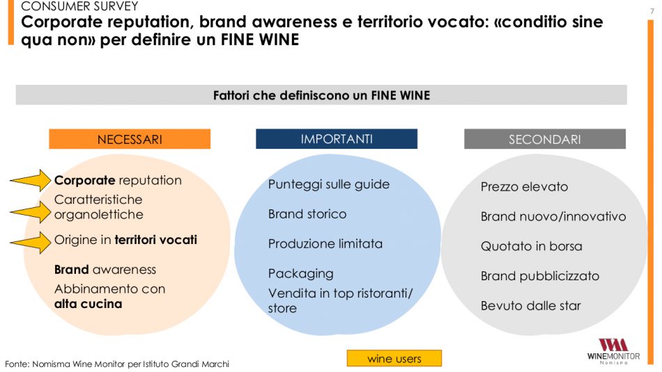 Altro capitolo della ricerca, infine, quello riferito alla promozione e quindi alle attività preferite dai wine lover inglesi per approfondire la conoscenza dei vini italiani di alta qualità. Richieste che, per il 41% degli inglesi intervistati nell’indagine, vedono prevalere le degustazioni come il più utile strumento, in particolare nei ristoranti, nei winebar e nei locali, che rappresentano il canale ideale soprattutto per gli old Millennials (28%) e per chi dispone di redditi medi mensili medio-alti (27%). In generale, malgrado ancora oggi la maggioranza degli inglesi preferisca bere vino tra le mura domestiche, si evince un andamento crescente per i consumi di qualità fuori casa anziché in Gdo (lo pensano 2 consumatori su 3), specie se si guarda a grandi città come Londra, sempre più in fermento sul fronte dei ristoranti e degli chef di livello. Consequenziale, dunque, che uno dei fattori rilevanti nell’identificazione di un fine wine sia proprio la possibilità di abbinamento a cibi raffinati e a proposte di alta cucina (criterio di scelta per il 50% dei consumatori). Ancora più decisivi risultano, infine, il brand (64%), le caratteristiche organolettiche superiori (62%) e la provenienza da specifici territori altamente vocati (52%).