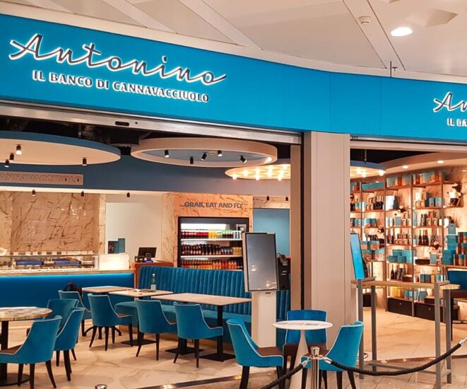 Per chi viaggia in Italia non c’è miglior benvenuto o arrivederci di un buon piatto, e se a firmarlo è uno chef con Tre Stelle Michelin è come stendere ai viaggiatori internazionali che arrivano e ripartono in aereo un tappeto rosso (ovvero, per l’Enit-Agenzia Nazionale del Turismo, 15 milioni di persone nel 2023, con un boom del +42% sul 2022 ed un recupero dell’87,7% sul 2019, con oltre il 20% dei turisti stranieri che sceglie il Belpaese attratto dallo stile di vita italiano e dalla sua “allure” di esclusività). Dall’altro lato della tavola, per i grandi nomi della ristorazione avere un proprio ristorante nel travel retail dei principali aeroporti italiani, ma anche internazionali, offre una visibilità potenzialmente infinita, come avviene per i vini ed i prodotti che sempre di più si trovano nei duty free, ma anche nei wine bar griffati da sempre più cantine italiane (con il giro d’affari globale del settore che, secondo un recente report Research Dive, arriverà a 225 miliardi di dollari nel 2031, con una crescita aggregata del 16% all’anno, di cui 56 miliardi legati a vino e liquori). E in una ristorazione in aeroporto che “vola” sempre più in alto, anche Antonino Cannavacciuolo, amatissimo chef Tre Stelle Michelin con il ristorante Villa Crespi a Orta San Giulio sul Lago d’Orta, è “atterrato” nell’Aeroporto Internazionale di Milano Malpensa portando nell’Area Partenze del Terminal 1, in collaborazione con MyChef Italia, Antonino Il banco di Cannavacciuolo, il suo format smart gourmet, con street food innovativo e pasticceria pret à porter che rispecchiano la sua anima napoletana.