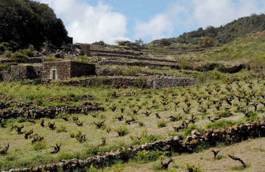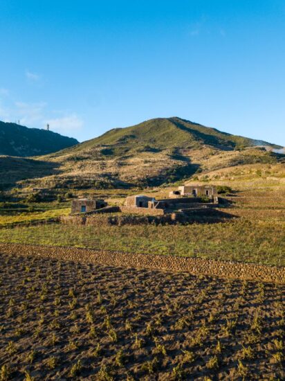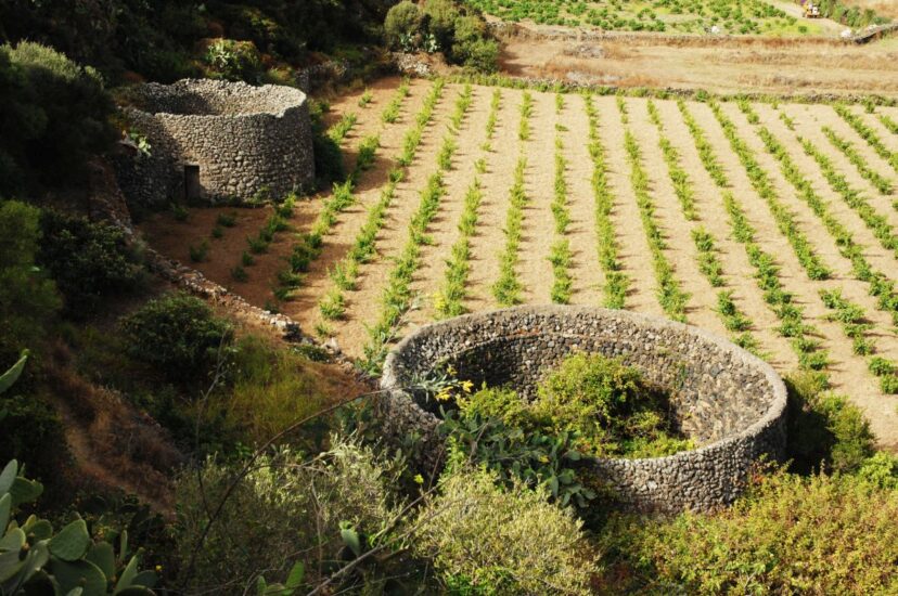 La vite ad alberello pantesca è coltivata all’interno di buche circolari profonde 50-60 cm che proteggono le piante dal vento, creando un microclima umido, essenziale per sopperire alla mancanza d’acqua. I viticoltori piantano la vite in un sistema di terrazzamenti sostenuti da muretti a secco costruiti con pietre vulcaniche, un elemento distintivo del paesaggio agricolo dell’isola. Questi terrazzamenti permettono la coltivazione su pendii scoscesi preservando il terreno. Le piante, allevate basse, si sviluppano così con una forma ad ombrello che ottimizza la captazione della rugiada e protegge i grappoli dall’intensa irradiazione solare. Gli agricoltori dell’isola, custodi di questa tradizione millenaria, mantengono con devozione i terrazzamenti e le coltivazioni, scongiurando l’abbandono di un territorio ad alto rischio idrogeologico.