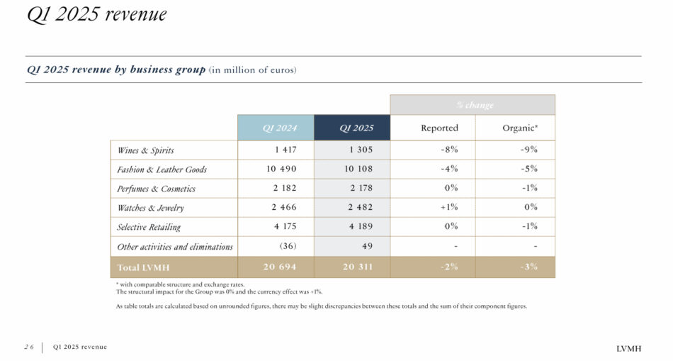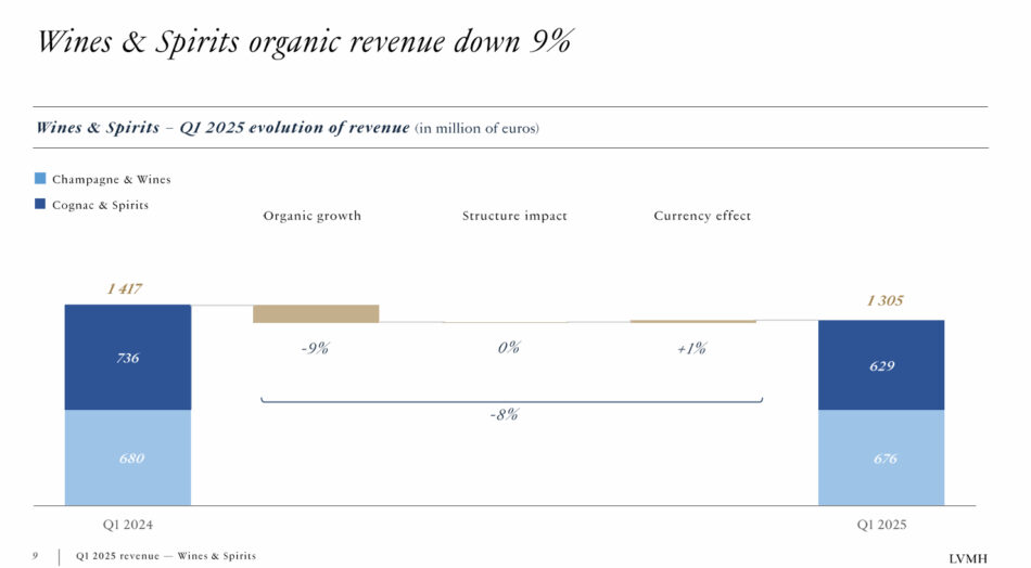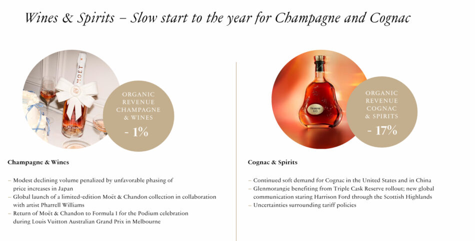 “Lo Champagne è calato leggermente, riflettendo la continua normalizzazione della domanda. Moët & Chandon è tornato sul podio come Champagne Ufficiale della Formula 1. Il Cognac è stato frenato dalla domanda più debole in Cina e negli Stati Uniti. Il portafoglio di vini rosati provenzali ha avuto un buon inizio d’anno”, commenta Lvmh. Ma i numeri sono significativi, e seguono di fatto il trend già visto per tutto il 2024.