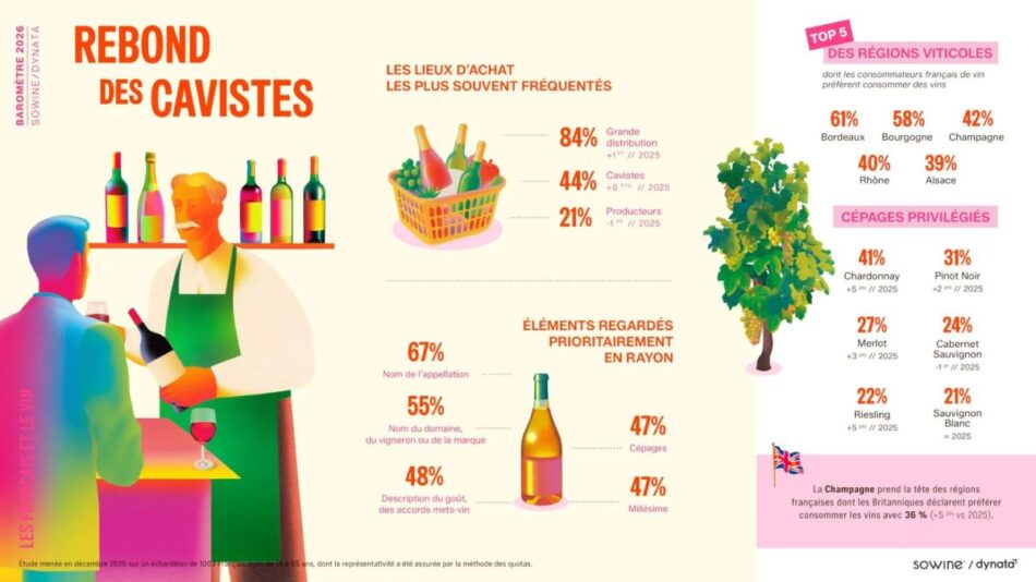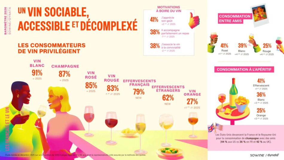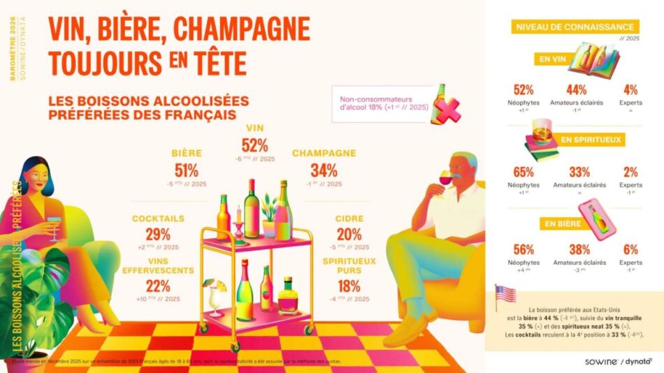 Nonostante un contesto di progressiva moderazione nei consumi di alcolici, il vino resiste come simbolo delle preferenze dei francesi e si conferma anche nel 2026 la bevanda alcolica più amata in Francia. A dirlo è il Barometro SoWine 2026, in collaborazione con Dynata, sulle abitudini di consumo dei francesi, che, pur registrando segnali di cambiamento che ridisegnano la mappa delle abitudini di consumo nazionali, per il terzo anno consecutivo vede il vino in testa alle preferenze con il 52% delle citazioni (ma a -6 punti sul 2025) davanti alla birra (51% e anche questa in calo di -5 punti), allo Champagne (34%, a -1 punto), cocktail (29%, in crescita di +1 punto) e gli spumanti (22%, in forte aumento di +10 punti).