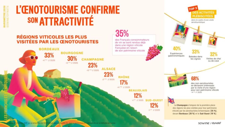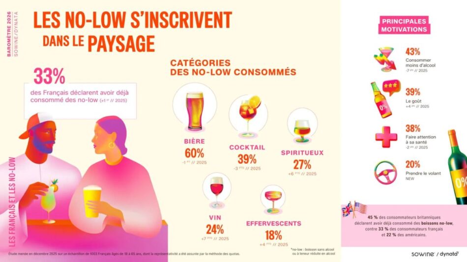 Ma, soprattutto, i francesi preferisco il vino per il motivi di gusto (41%), perché è perfetto per accompagnare il cibo (38%) e perché lo associano alla convivialità (38%): una bevanda, cioè, socievole, accessibile e disinvolta. Lo scenario vede, poi, l’enoturismo sempre più attrattivo: il 35% dei consumatori ha visitato una regione viticola, con Bordeaux al 33%, Borgogna al 30% e Champagne al 23% come mete principali. Ma nel quale avanzano anche i prodotti “No-Lo”, consumati dal 33% dei francesi, con la birra analcolica al 60% e il vino analcolico che segna la crescita maggiore attestandosi al 24% (+7 punti).