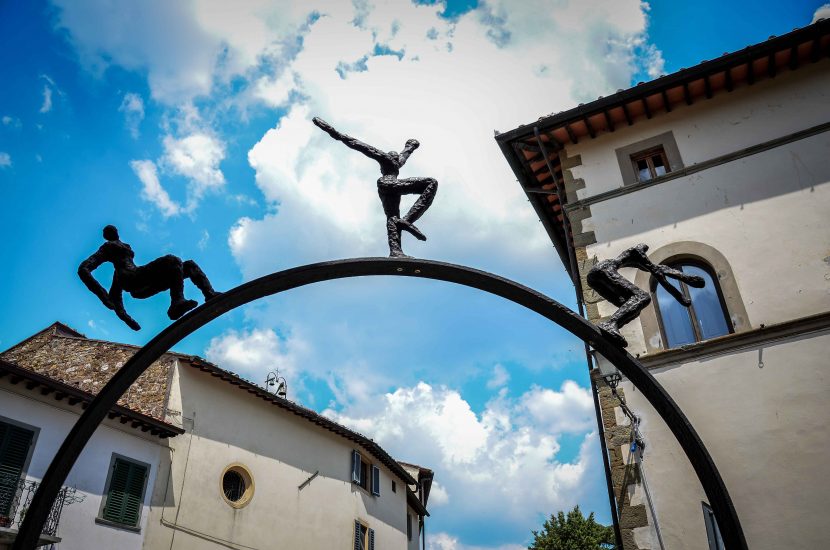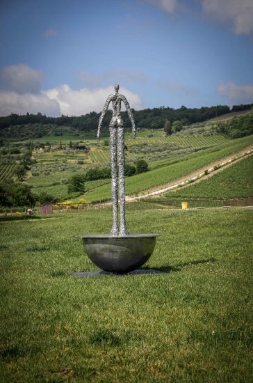 Il prologo è a Panzano, con “Le temps qui passe” nella piazza principale, mentre di fronte alla macelleria di Dario Cecchini troviamo le due “Sentinelle”, e proseguendo verso la chiesa del paese ecco “Espace Temps”, quindi ci si imbatte in “Saute-mouton” (Cavalluccio) e poco dopo in “Marie”, un omaggio a tutte le donne. Da qui, inizia il viaggio attraverso le aziende del Chianti Classico. Prima tappa Fontodi, la griffe della famiglia Maentti, che ospita tre sculture, “Triple protection” (Tripla protezione) che si affaccia sui vigneti; “Les Arbres de vie” (Gli alberi della vita), un magico bosco di alberi stilizzati; “Nid d’etres” (Il nido degli esseri umani), un vero e proprio nido realizzato con i tralci dei vigneti. Seconda tappa, Tenuta Casenuove, per la quale sono state scelte “Air N °2” e “Air N °3”, posizionate sul prato d’ingresso, e sempre all’esterno troviamo “Eoles” (Eoliche), che girano nella brezza, simbolo della fragilità umana, mentre all’interno della cantina “Hommage à Cesar”, un omaggio in chiave umoristica al famoso artista francese.