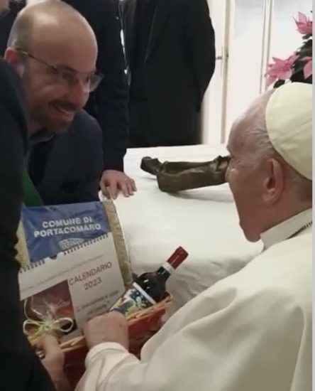 E il sindaco di Portacomaro, Alessandro Balliano, come vuole la tradizione, ha donato al Papa un cesto di prodotti del Monferrato, tra cui l’immancabile Grignolino Laudato Si’ 2021, l’ultima annata.