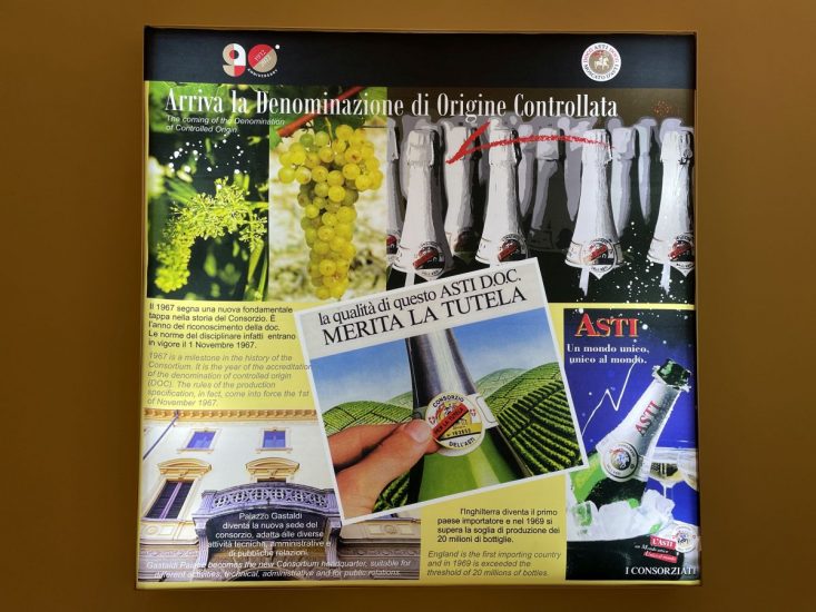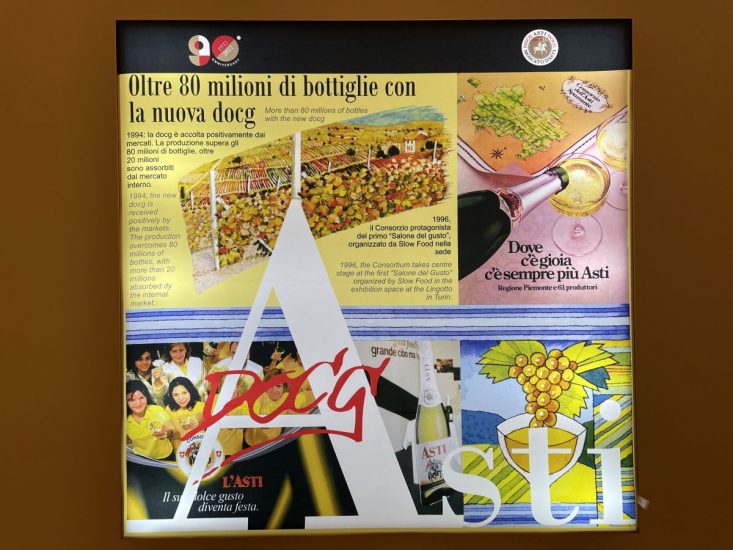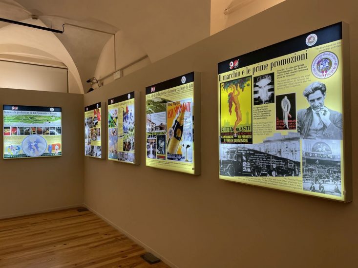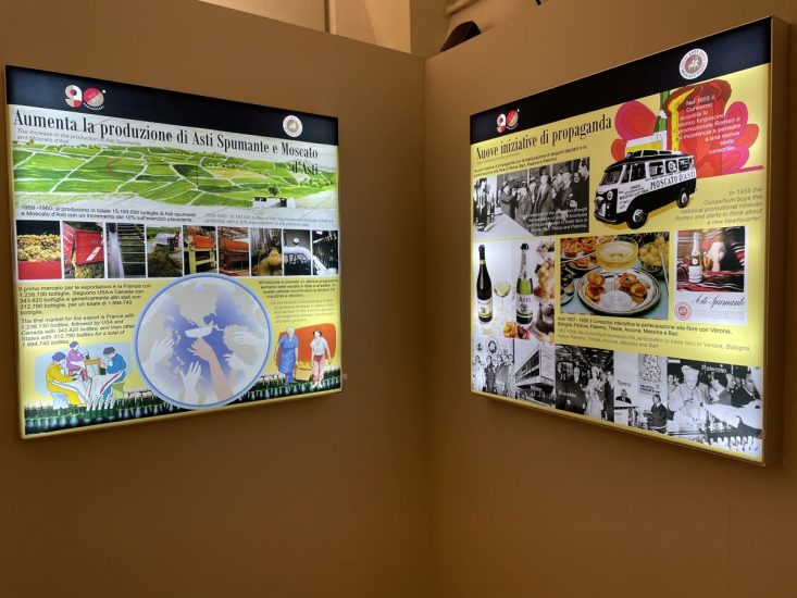 La mostra, curata da Pier Ottavio Daniele ed alla quale hanno collaborato nomi come Giancarlo Ferraris, Andrea Triberti, Massimo Branda, Luca Percivalle, Zeta Solution e Designstudio25, apre uno spazio di riflessione non soltanto celebrativo, ma utile per evidenziare il contributo di crescita culturale ed economica che l’Asti ha dato al mondo del vino italiano e non solo. “Questo prestigioso traguardo dimostra la longevità della Docg Asti, che col passare del tempo ha saputo rinnovarsi seguendo i cambiamenti della società e del mercato, sviluppando innovazioni tecnologiche, sempre in sinergia con i produttori che da generazioni lavorano con dedizione e passione sul territorio”, sottolinea il presidente del Consorzio Lorenzo Barbero. “Novant’anni per un Consorzio sono un traguardo importante e il Consorzio dell’Asti è un Consorzio storico così come lo è la Denominazione, riconosciuta come Doc negli anni Sessanta e poi Docg negli anni Novanta - aggiunge Pondini - ma che è il frutto di una tradizione spumantistica che si colloca nel territorio di Canelli e che ha dato vita all’Asti Spumanti fin dal 1865 quando Carlo Gancia sperimentò il primo spumante Metodo Classico italiano che si basava proprio sulle uve Moscato. È importante ripercorrere le tappe che i produttori in forma associato hanno portato avanti in questi 90 anni e i traguardi raggiunti, per i traguardi che si vogliono porre per il futuro. La mostra racconta i tratti salienti dell’associazione che ha portato avanti la tutela, la vigilanza e la promozione della Denominazione. E ci è sembrato opportuno soprattutto per il pubblico di consumatori di dare risalto ai momenti storici della comunicazione ed a ciò che è stato fatto dal Consorzio e dalle aziende per la sua promozione da inizio secolo con i manifesti che richiamavano lo stile Liberty al Carosello degli anni Cinquanta, fino alle pubblicità degli ultimi decenni con George Clooney, Naomi Campbell e Alessandro Borghese”.