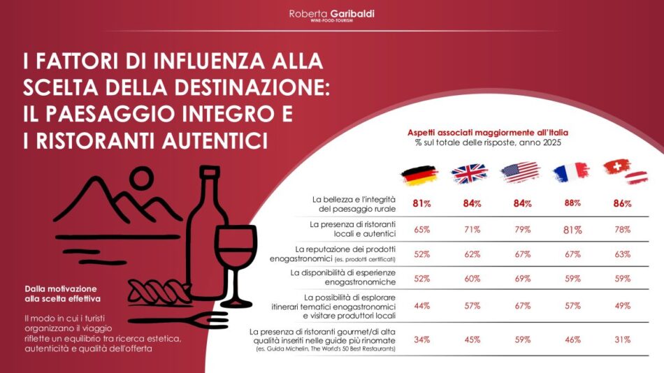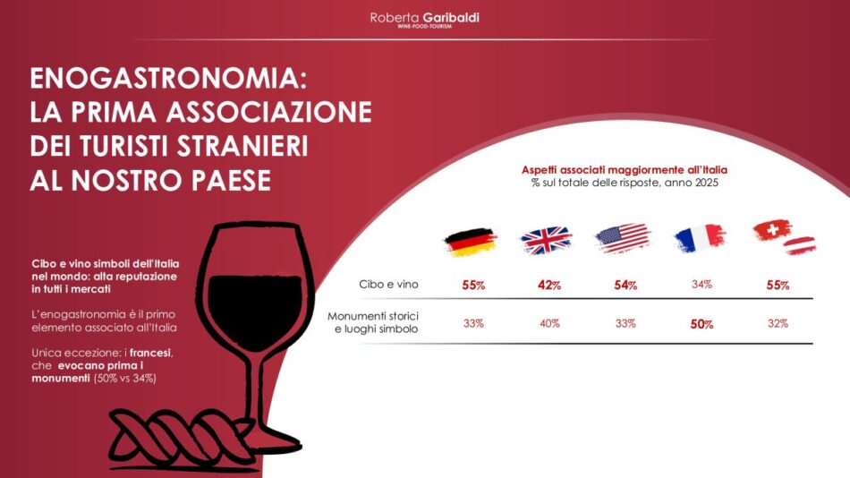 Tra viaggi domestici ed internazionali, negli ultimi 3 anni, la quota di turisti che ha viaggiato per l’enogastronomia varia dal 60% in Regno Unito al 74% in Francia, con un aumento, dal 2016 (primo anno del Rapporto, ndr) tra i 15 a 28 punti percentuali. E il Belpaese è associato principalmente come destinazione del viaggio a “cibo e vino”, citati dal 55% dei tedeschi e degli svizzeri/austriaci e dal 54% degli statunitensi; solo tra i francesi che scelgono l’Italia prevalgono i monumenti storici (50%). Nella scelta della destinazione, contano soprattutto la bellezza del paesaggio rurale (oltre l’80% in tutti i mercati, con un massimo dell’88% in Francia) e la presenza di ristoranti locali (81% in Francia, 79% negli Usa). Gli americani attribuiscono più valore a esperienze tematiche (69%) e ristoranti gourmet (59%). Esperienze che vanno dai ristoranti locali (68% per i francesi, 71% per austriaci e tedeschi) alle visite in cantina (fino al 36% per austriaci e svizzeri), seguite da caseifici (34% per i francesi) e birrifici (25% per i francesi, 26% per gli americani). Le principali motivazioni per scoprire l’enogastronomia, sono provare nuove esperienze (52% in Uk e Usa) e arricchire il proprio bagaglio culturale (34% in Francia), seguite dal divertimento (36% in Usa), mentre i francesi si distinguono, ancora una volta, nel vedere l’enogastronomia come occasione per concedersi un lusso (36%), e tedeschi e svizzeri/austriaci per immergersi nei paesaggi rurali. Le regioni più attrattive per i turisti internazionali? Toscana (per il 69% di americani e francesi, e per il 66% di austriaci e svizzeri), Sicilia (66% di francesi, 62% di americani), Sardegna e Puglia (63% di francesi). E tra le destinazioni enoturistiche prevalgono Chianti (fino al 41% degli americani) ed Etna (fino al 40% dei francesi), seguite da Montepulciano (42% degli svizzeri), Montalcino (27% degli americani) e Bolgheri (25% di austriaci e svizzeri). Buone preferenze anche per le Cinque Terre (26% di austriaci e svizzeri) e per la “Food Valley” dell’Emilia-Romagna (24% di americani). È la fotografia scattata dal “Rapporto sul Turismo Enogastronomico Italiano” 2025 curato da Roberta Garibaldi (che, in un’intervista a WineNews, ha tracciato il bilancio del settore e indicato i trend del futuro), presentato oggi al “Bto-Be Travel Onlife” a Firenze, e che si focalizza, per la prima volta, sulla domanda internazionale, analizzando in modo comparativo i 6 mercati esteri più importanti per l’Italia - Germania, Regno Unito, Stati Uniti, Austria, Svizzera e Francia - ed evidenziando “incrementi vertiginosi” della capacità attrattiva del gusto italiano come motivazione di viaggio nel Belpaese.