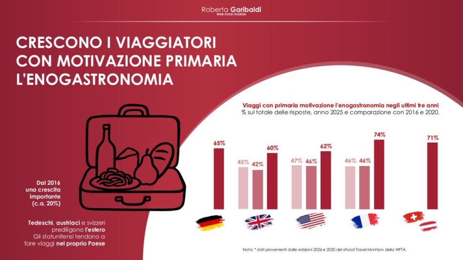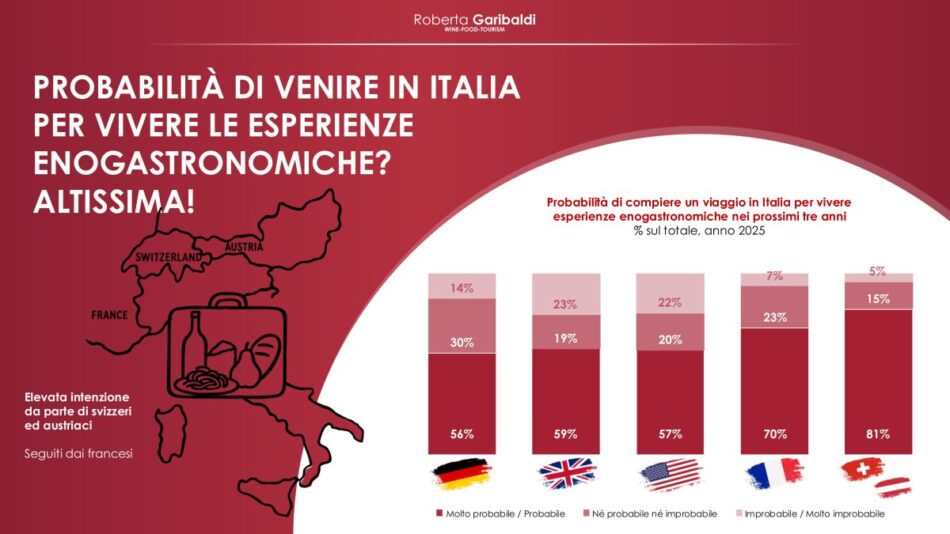 E secondo il quale, anche per i prossimi 3 anni, l’intenzione di viaggiare in Italia con questa motivazione di viaggio da parte dei turisti stranieri è altissima: la quota “molto probabile e probabile” va dal 55% in Germania all’81% in Austria e Svizzera (con l’Uk al 59%, gli Usa al 57%, e la Francia al 70%); i “molto probabile” toccano il 50% in Austria e Svizzera e il 34% in Francia. E l’inclusione di esperienze enogastronomiche nel pacchetto vacanza appare importante: le valutazioni 8-10 arrivano al 62% negli Usa, seguite dal 38–40% in Uk, Francia, Austria e Svizzera, e il 36% in Germania. Un alto potenziale, oltre al mondo vino, caratterizza l’oleoturismo, con esperienze come le cene negli uliveti (oltre 50% in tutti i mercati) e il turismo della birra. E, guardando alla disponibilità di spesa, per un pasto tipico la maggioranza si concentra tra 21 e 60 euro (oltre il 50% dei casi in ogni Paese), per i tour in cantina con degustazione prevale la fascia 21-40 euro (fino al 35% in area Austria-Svizzera), mentre le esperienze in acetaia e nei musei del gusto si collocano per oltre la metà dei rispondenti sotto i 20 euro.