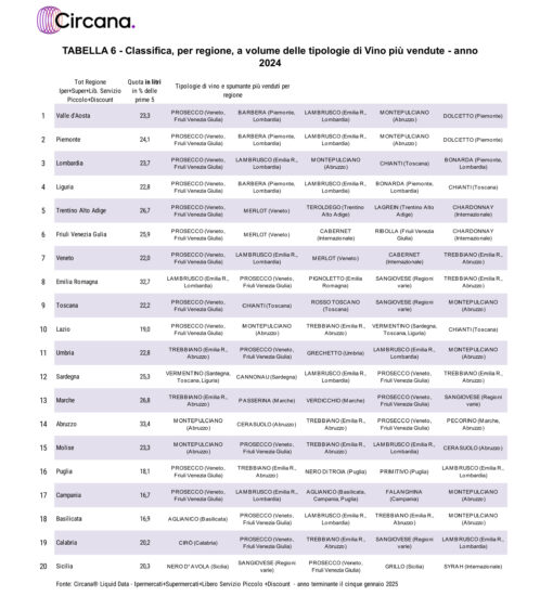 Nella classifica dei vini più venduti, al primo posto assoluto c’è il mondo Prosecco, con 49,5 milioni di litri venduti (+4,7% sul 2023) per 362,4 milioni di euro (+2,8%), con lo spumante veneto-friulano che, nonostante un calo del -1,9% nel prezzo medio, ha il valore unitario più elevato in “top 10”, a 5,51 euro a bottiglia da 0,75 l. Sul podio seguono, a distanza, il Chianti, con 16,3 milioni di litri (-2,9%) per 95,8 milioni di euro (-1%), ed il Lambrusco con 15,1 milioni di litri (-4%) per 57,2 milioni di euro (-3,7%). Posizione n. 4 per il Montepulciano d’Abruzzo, a 14,1 milioni di litri (+1,7%) per 51,6 milioni di euro (+0,8%), davanti agli Chardonnay di varie provenienze, anche estere, a 11,7 milioni di litri (+3,1%) per 53,9 milioni di euro (+5,2%), mentre cresce a doppia cifra, alla posizione n. 6, il Vermentino di Sardegna, Toscana e Liguria, a 11,6 milioni di litri (+11,7%) per 84,1 milioni di euro (+13,5%), con il varietale legato alle coste del Mar Tirreno che spunta anche il secondo prezzo medio più alto in “top 10”, a 5,44 euro a bottiglia (+1,6%).
