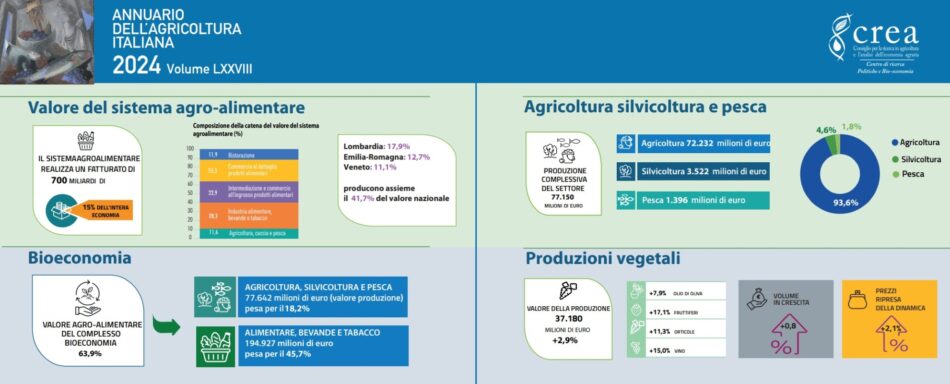 “L’Annuario dell’Agricoltura Italiana offre da 78 anni una fotografia completa ed approfondita del nostro sistema agroalimentare, intercettandone le evoluzioni e interpretandone fenomeni e dinamiche, dal livello regionale al contesto globale, in una prospettiva di ampio respiro - ha detto il presidente Crea Andrea Rocchi - anche nel 2024, l’agroalimentare italiano ha raggiunto numeri importanti, con un peso del 15% sull’economia nazionale e un export da record. Si è dimostrato resiliente, sostenendo la crescita dell’intero sistema agroalimentare, nonostante tensioni geopolitiche, criticità logistiche e sfide ambientali. Le opportunità offerte dal Pnrr e dalla Pac 2023-2027 rappresentano leve fondamentali per rafforzare le filiere e modernizzare il tessuto produttivo. Continua il nostro impegno come Crea a fianco del settore per renderlo più competitivo, sostenibile e con standard qualitativi sempre più elevati”.
