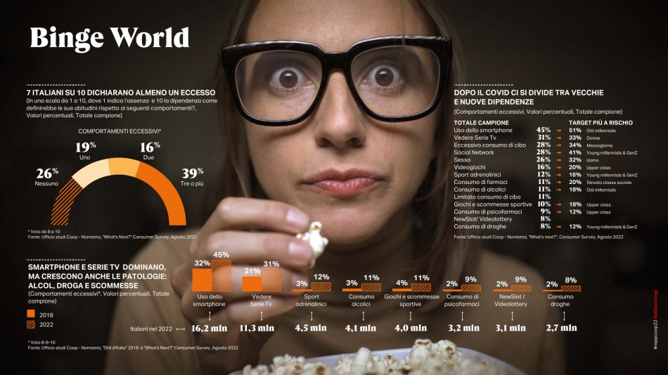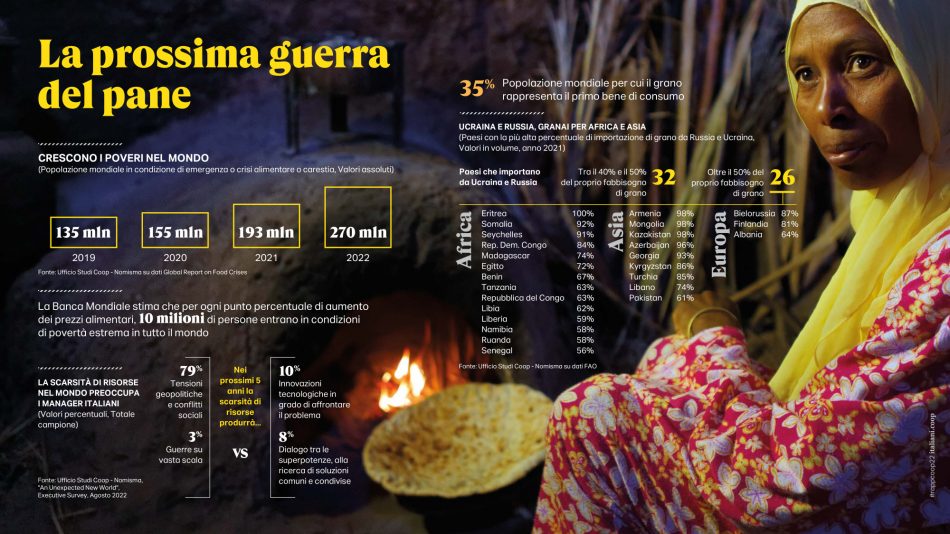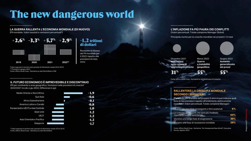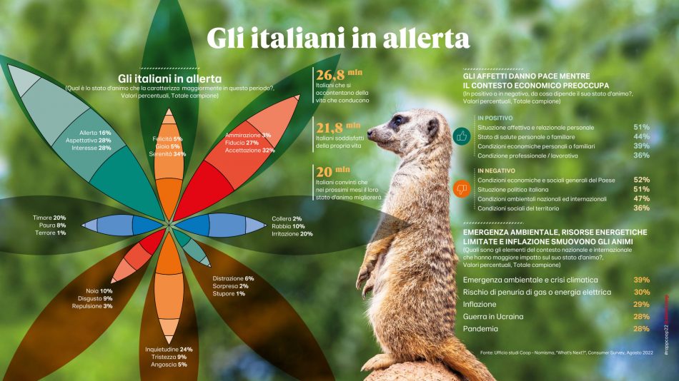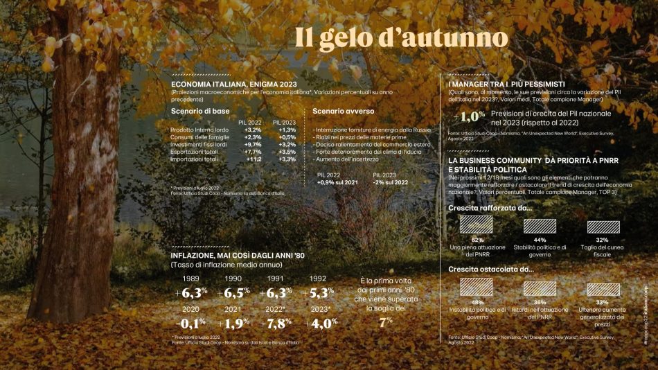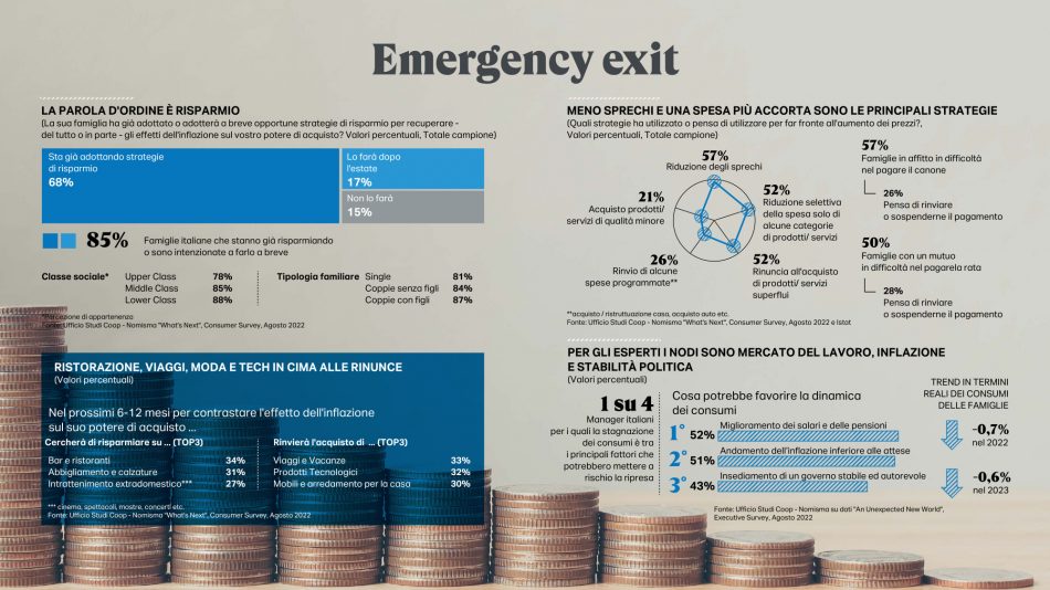 L’edizione 2022 del “Rapporto” è tutta orientata a interpretare l’eccezionale cambiamento dello scenario e a comprenderne gli effetti sulla vita quotidiana degli italiani. Per fare questo, oltre alle fonti di solito utilizzate, si è avvalsa di due diverse survey intitolate “What’s next?” e “An unexpected new world”, condotte entrambe nella seconda parte dell’agosto 2022. La prima ha coinvolto un campione di 1.000 italiani rappresentativo della popolazione over 18 (18-75 anni). La seconda si è rivolta ad un panel della community di italiani.coop e ha coinvolto 860 opinion leader e market maker fruitori delle passate edizioni del “Rapporto”. Tra questi sono stati selezionati 473 ruoli apicali (imprenditori, ad e direttori, imprenditori, liberi professionisti e consulenti) in grado di anticipare più di altri le tendenze future del Paese.