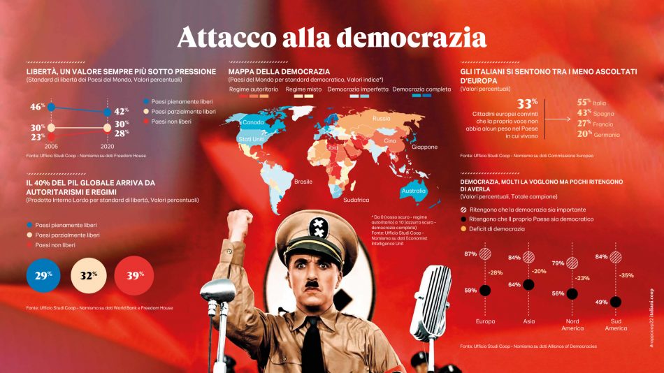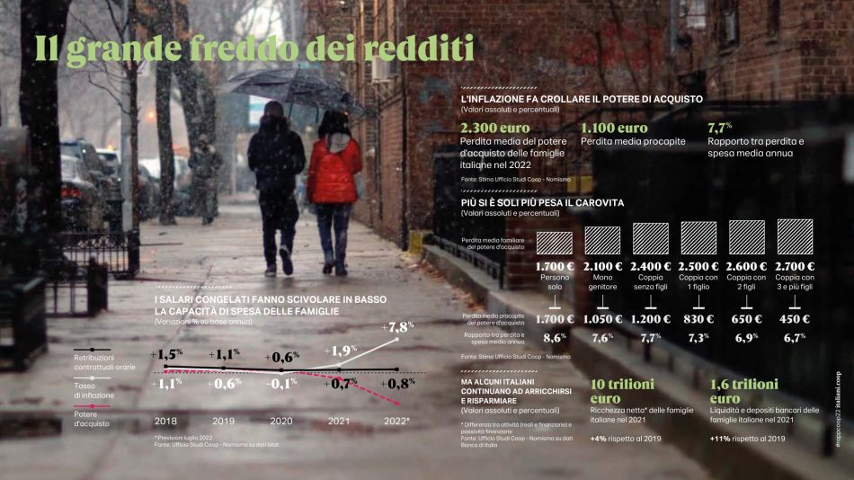 Tornando alla “tempesta perfetta” scatenata dalla pandemia, dalla crisi climatica, dalla guerra e dall’inflazione, il propagarsi degli effetti giorno su giorno profila all’orizzonte un pericoloso nuovo mondo in cui la democrazia è sempre più a rischio (il 40% del Pil globale arriva da Paesi non liberi), cresce la povertà alimentare, il commercio internazionale decresce e l’emergenza climatica è oramai drammatica quotidianità. Già la pandemia aveva provocato inevitabili cambiamenti e aveva aperto la strada a una nuova epoca di scarsità, ma mentre il mondo era impegnato a disinnescare la minaccia del Covid, l’invasione della Russia nei territori ucraini ha creato un effetto recessivo immediato sull’economia mondiale. Il Pil globale sconta un ribasso dal +5,7% del 2021 al +2,9% previsionale del 2022 e per l’Italia, le previsioni di crescita del Pil si attestano al +3,2% per il 2022 e al +1,3% per il 2023. In un possibile, ma sempre più verosimile scenario avverso Banca d’Italia non esclude il ritorno a un Pil in negativo nel 2023 (-2%). La doppia dipendenza dell’Europa dall’area del conflitto (il gas dalla Russia e le commodities alimentari da Ucraina e Russia) ha fatto impennare l’inflazione. In Italia il dato a doppia cifra del +7,8% nel 2022 ci fa ritornare indietro di 40 anni (era al +9,2% nel 1985) e da allora a oggi mai aveva toccato tale picco; per alcuni segmenti di consumo la macchina del tempo dei rincari segna date ancora più lontane. Così l’incremento dei prezzi per le spese di abitazione e utenze torna ai livelli del 1980 o per i trasporti si ritorna indietro fino al 1984. 2.300 euro è la perdita media del potere d’acquisto delle famiglie stimata per il 2022, tanto peggio se si vive da soli.