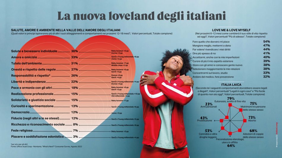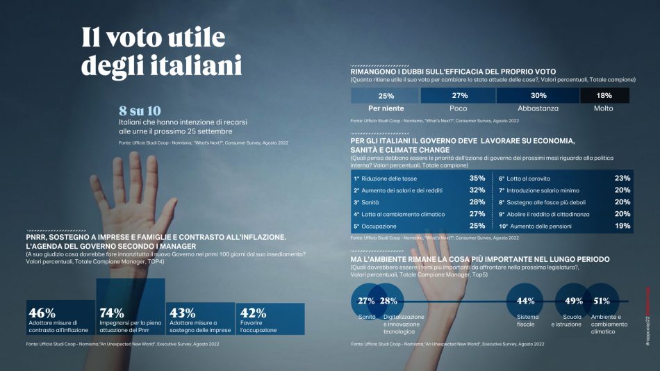 Uscita dal Covid o perlomeno dalla sua fase più acuta, l’Italia mostra una doppia identità. Di fronte al caos del mondo rispunta per la larga maggioranza degli italiani la dimensione personale come meta di tutte le attenzioni, la salute, il benessere, gli affetti, l’amore. Questa dimensione rende ragione dei desiderata degli italiani che, intervistati alla fine del mese di agosto, guardando avanti vogliono fare ciò che davvero gli piace (lo afferma il 54%) seguito da propositi di mangiare meglio e mettersi a dieta (47%), rivendicare i propri diritti (44%), curare l’aspetto esteriore (39%), stare con gli amici (38%). Una sorta di rifugio nella propria confort zone, consapevoli comunque che qualcosa sta per accadere e per questo anche vigili e circospetti, molto attenti a ciò che succede intorno a loro e perennemente informati. Da qui anche la dichiarazione di voler andare a votare nelle imminenti elezioni politiche da parte di 8 italiani su 10, anche se più della metà, ovvero il 55% a fronte di una media europea che si attesta su un 33%, è convinto che la propria voce non abbia alcun peso nel Paese in cui vive. Forse anche perché temi importanti e oramai molto meno divisivi che in passato come eutanasia, matrimoni gay o adozioni a coppie dello stesso sesso, apprezzati dalla maggioranza degli italiani, rimangono ancora fuori dall’agenda politica.