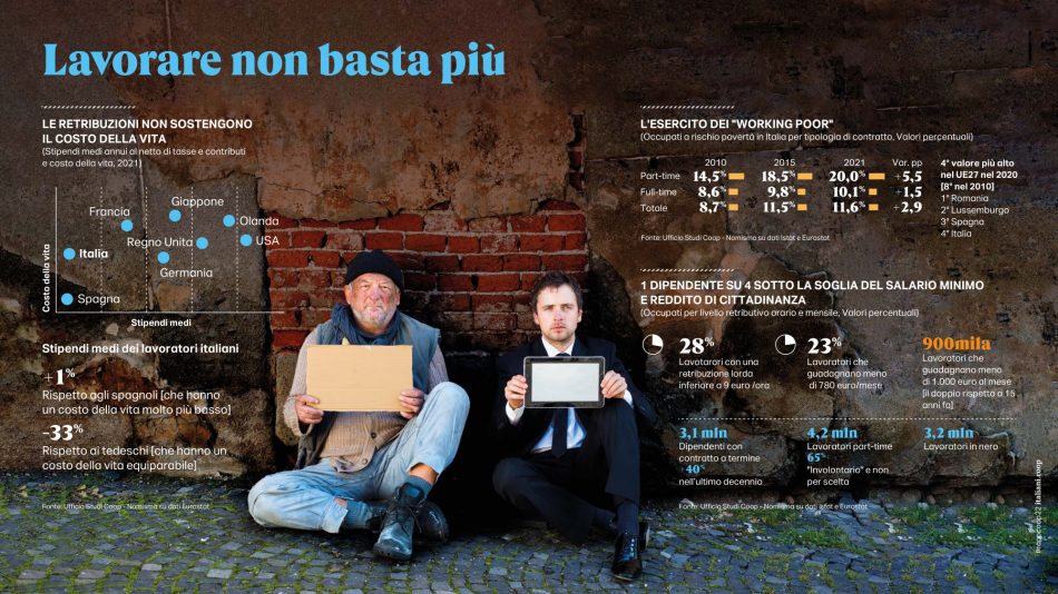 Intanto il lavoro è sempre più povero e lavorare non basta più. Nel rapporto tra costo della vita e stipendi medi, l’Italia è il fanalino di coda tra le principali economie europee, con un salario del 33% più basso di quello dei tedeschi per esempio che hanno un costo della vita equiparabile al nostro, mentre guadagniamo come gli spagnoli che hanno un costo della vita del 19% inferiore. Un occupato su 5 tra coloro che hanno contratti part time è oggi a rischio povertà (era uno su sei nel 2010) e un dipendente su 10 full-time corre lo stesso rischio. A conti fatti sono 900.000 in Italia oggi i lavoratori che guadagnano meno di 1.000 euro al mese, il doppio rispetto a 15 anni fa.