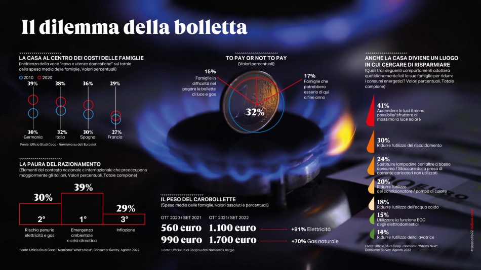 Detto questo, al netto delle ideologie, il più prosaico ma dirimente dilemma della bolletta è ben lontano dall’essere risolto e anzi pesa come un macigno sulle famiglie già a corto d’ossigeno in previsione dell’autunno imminente. Il 57% infatti dichiara già oggi la difficoltà di pagare l’affitto e il 26% pensa di sospendere o rinviare il pagamento e, se restringiamo il campo a luce e gas, un italiano su 3 entro Natale potrebbe non coprire più le spese per le utenze. Essere le formiche d’Europa e risultare ultimi nella classifica di chi dichiara di spendere di più per godersi il presente (lo sostiene solo il 40% degli italiani a fronte del 46% degli inglesi e del 44% di tedeschi e francesi) non basta più. Neanche li mette al riparo la spending review energetica che le famiglie sembrano aver messo in campo, tanto che il 41% si dichiara già molto attento a accendere le luci il meno possibile, il 30% è già consapevole di ridurre il riscaldamento domestico e molti sono gli italiani abituati ad un uso razionale degli elettrodomestici.