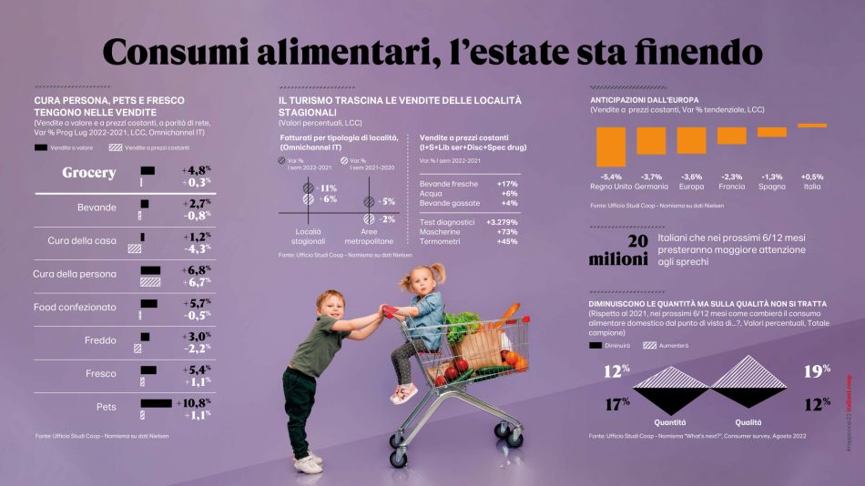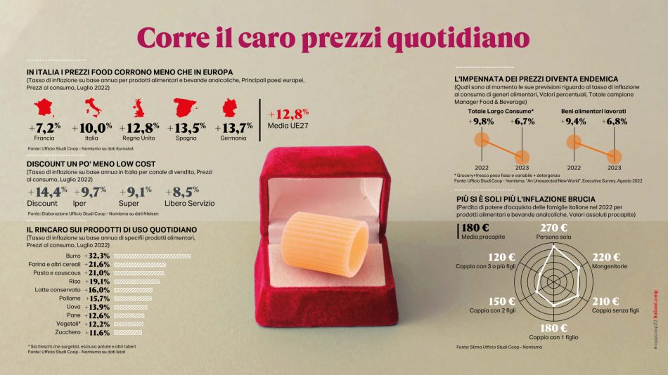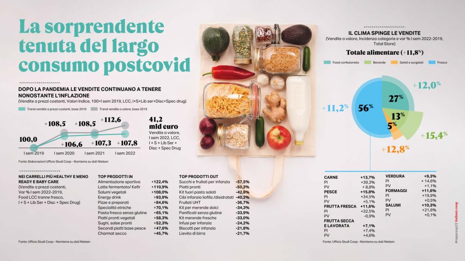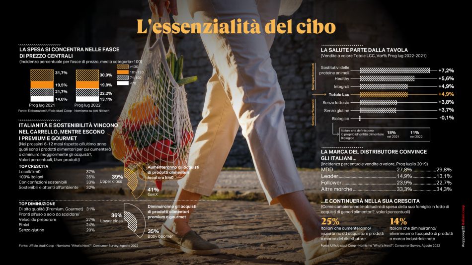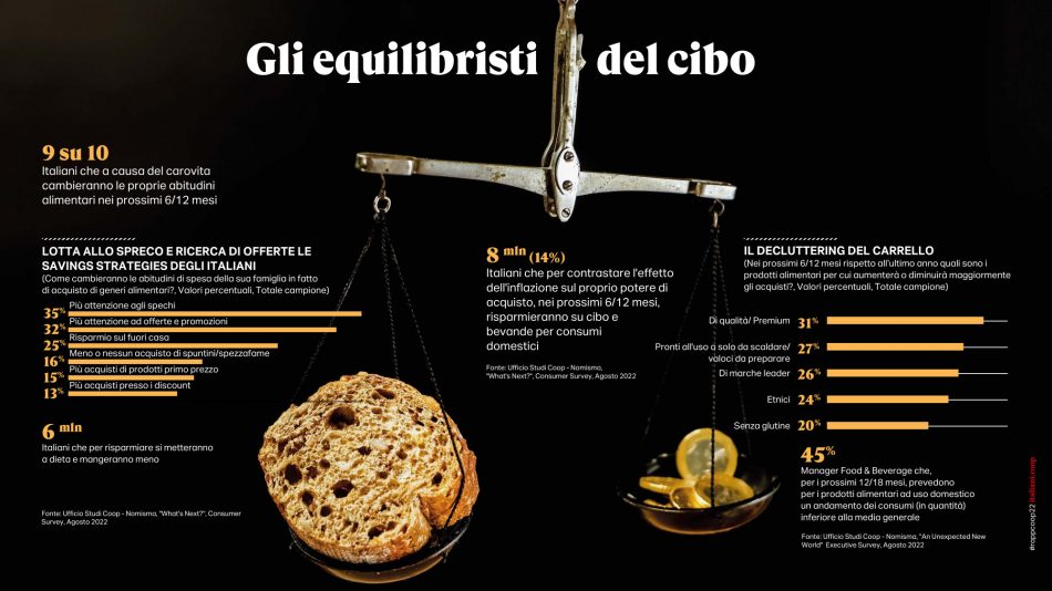 Pandemia, crisi climatica, guerra, inflazione. Il sommarsi simultaneo di una serie di eventi terribili e imprevisti ha innescato nei primi mesi 2022 una “tempesta perfetta”, che non può risparmiare la filiera del cibo, dove l’inflazione picchia duramente in Italia, seppur meno che in altri Paesi europei (+10% a fronte del +13,7% della Germania). Paesi in cui già si registrano i primi cali nei volumi di vendita che la calda e lunga estate italiana ha per il momento frenato, complici le temperature e il turismo. Eppure in modo anche sorprendente la spending review già in essere degli italiani si concentra su altri comparti, ma non tocca per il momento il cibo: sono 24,5 milioni gli italiani che, nonostante l’aumento dei prezzi, non sono disposti a scendere a compromessi nelle loro scelte alimentari e nei prossimi mesi prevedono di diminuire la quantità, ma non la qualità del loro cibo. Ritorna anche il “cooking time” sperimentato in lockdown, si passa più tempo nella preparazione dei pasti, e ci si impegna a sperimentare nuovi piatti. Il carrello non è più la “miniera” da cui attingere per finanziare altri consumi, ma un “fortino” da proteggere rinviando invece quel downgrading degli acquisti a cui si era ricorso in altri momenti di crisi. Al tempo stesso il cibo a cui non si intende rinunciare pare essere soprattutto quello più sobrio e basico, senza orpelli e sovrastrutture, con l’italianità e la sostenibilità che sono gli elementi imprescindibili che erodono mercato ad altre caratteristiche in passato maggiormente considerate. In calo, invece, il cibo gourmet, il ready to eat, il biologico e l’etnico. È la fotografia scattata dall’anteprima digitale, presentata oggi, del “Rapporto Coop 2022 - Consumi e stili di vita degli italiani di oggi e di domani” redatto dall’Ufficio Studi di Ancc-Coop (e che è parte integrante di italiani.coop https://italiani.coop/, il portale di ricerca e analisi sulla vita quotidiana degli italiani), con la collaborazione scientifica di Nomisma, il supporto di analisi di Nielsen e i contributi originali di Gs1-Osservatorio Immagino, Iri Information Resources, Mediobanca Ufficio Studi, Nomisma Energia e Npd. E che, per la gdo italiana, profila un futuro denso di incognite, schiacciata da un lato dall’incremento dei prezzi e dal caro energia e dall’altro dalla necessità di attutire l’impatto dei prezzi sui portafogli delle famiglie, dopo un 2021 che per Coop e le cooperative associate all’insegna, dai numeri emersi nell’Assemblea di Bilancio di Coop Italia, si era chiuso nel segno della stabilità, con un giro d’affari complessivo pari a 14,3 miliardi (13,2 miliardi quello sviluppato solo dalla parte retail), una quota di mercato nella grande distribuzione al 12,5% e alcuni indicatori economici importanti sostanzialmente confermati: l’occupazione generata si attesta sui 56.000 dipendenti, la percentuale di donne in ruoli direttivi sale al 34%. Il prodotto a marchio raggiunge i 3 miliardi di euro con una incidenza del 30% sul totale vendite. E sono oltre 6,4 milioni i soci Coop (oltre un quarto delle famiglie italiane è proprietaria delle 78 cooperative associate) con una prevalenza di donne.