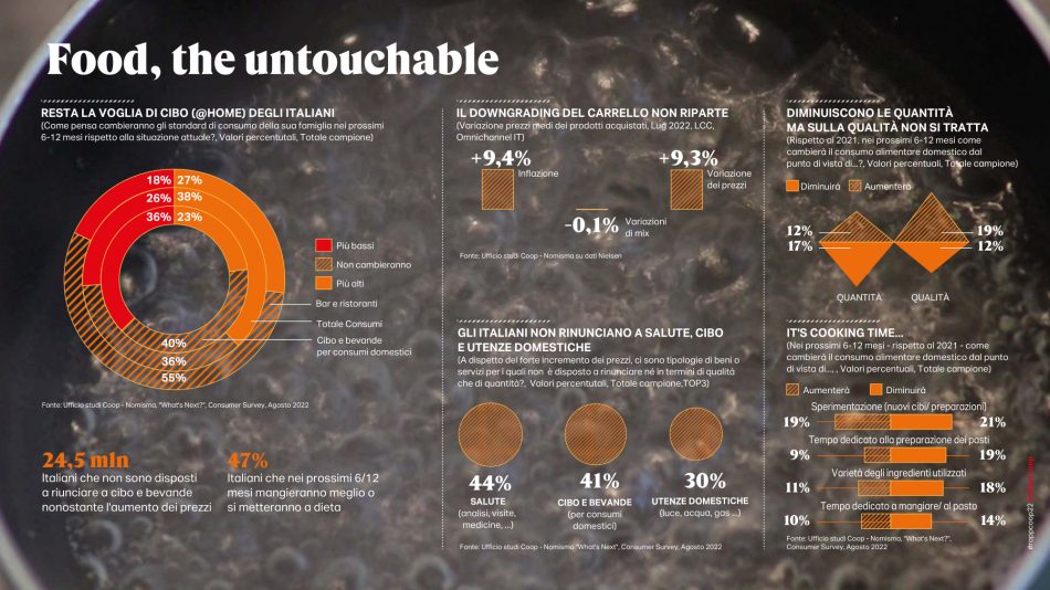 Ma veniamo finalmente al cibo: la tempesta perfetta non poteva infine risparmiare la sua filiera, anzi ha trovato proprio nelle catene di approvvigionamento globali uno dei suoi principali epicentri. Oggi il mercato italiano sembra manifestare una dinamica inflattiva dei prodotti alimentari lavorati prossima alla doppia cifra, ma ancora in ritardo rispetto ad altri Paesi europei (da noi un +10% a fronte del +13,7% della Germania o del +13,5% della Spagna). Allo stesso tempo in maniera inattesa, nonostante questa spinta dei prezzi, i volumi di vendita hanno tenuto (+7,8% primo semestre 2022 vs 2019), complice la calda e lunga estate italiana, il ritorno del turismo straniero e la capacità della distribuzione moderna di imporsi sugli altri canali di vendita specializzati. Il mercato italiano è però al momento l’unico a mantenere un trend positivo dei volumi (+ 0,5% contro -5,4% del Regno Unito, -3,7% della Germania, -2,3% della Francia e -1,3% della Spagna) e questa differenza come il ritardo all’incremento dei prezzi sembra presagire ad una inversione di tendenza imminente. Pur di fronte a questo scenario non favorevole, la spending review degli italiani in modo anche sorprendente attivata su altri comparti per la prima volta da decenni non tocca il cibo. Sono 24 milioni e mezzo gli italiani che nonostante l’aumento dei prezzi non sono disposti a scendere a compromessi nelle loro scelte alimentari e nei prossimi mesi prevedono di diminuire la quantità ma non la qualità del loro cibo. Ritorna anche il cooking time sperimentato in lockdown; si passa più tempo nella preparazione dei pasti e ci si impegna a sperimentare nuovi piatti.